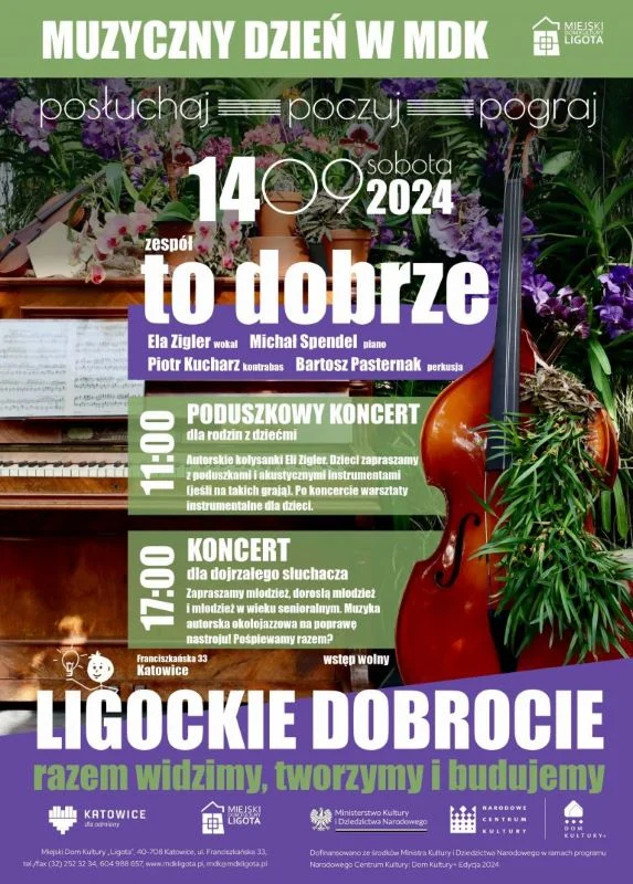 Już 14 września odbędzie się muzyczne wydarzenie w MDK Ligota. Będziecie mieli okazję posłuchać kołysanek autorstwa Eli Zigler oraz koncertu zespołu „To Dobrze”.
