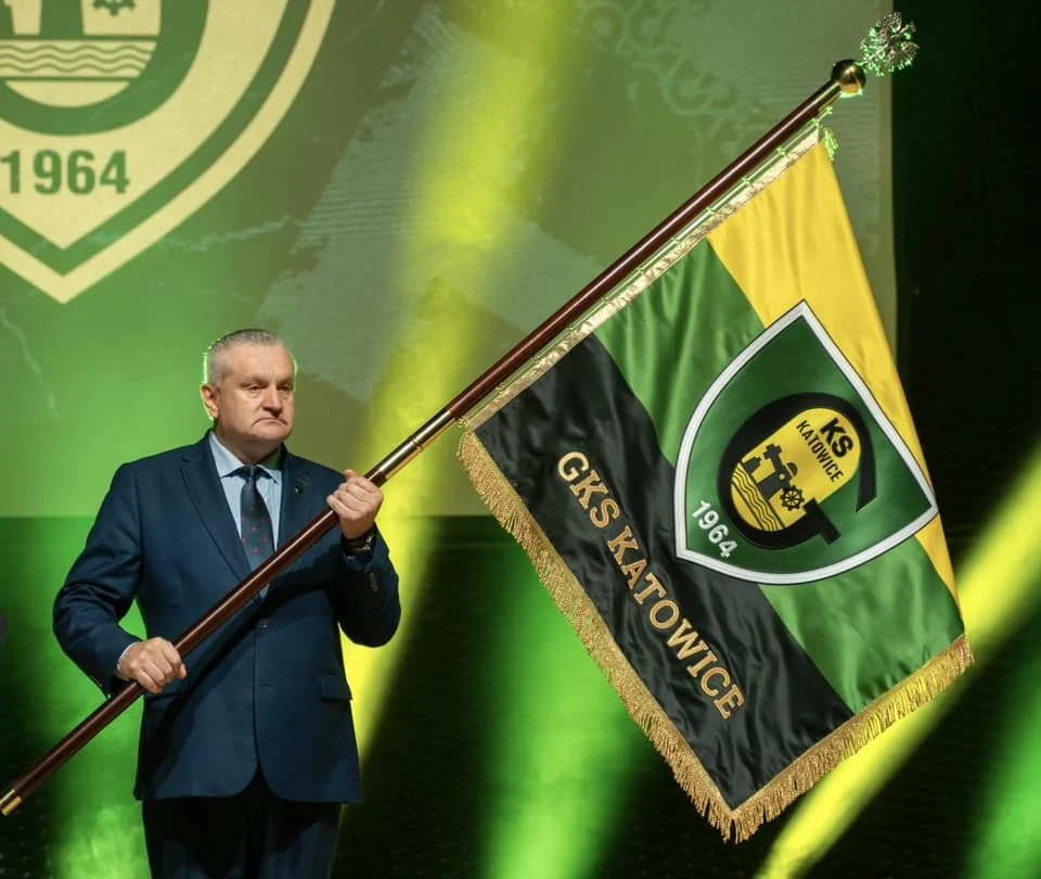 Jubileuszową uroczystość rozpoczęło nadanie klubowi GKS Katowice nowego sztandaru i przekazanie go prezesowi Klubu Krzysztofowi Nowakowi przez prezydenta Marcina Krupę.