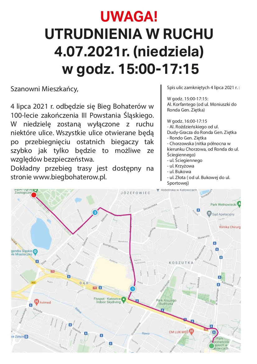 Bieg uliczny, którego trasa angażuje część miasta, wymaga od organizatorów czasowego zamknięcia dróg. W niedzielę zostaną wyłączone z ruchu niektóre ulice. Wszystkie drogi otwierane będą po przebiegnięciu ostatnich biegaczy tak szybko, jak tylko będzie to możliwe ze względów bezpieczeństwa. Dołożymy wszelkich starań, aby niedogodności wynikające z zamknięcie dróg w jak najmniejszym stopniu wpłynęły na komfort życia mieszkańców.
