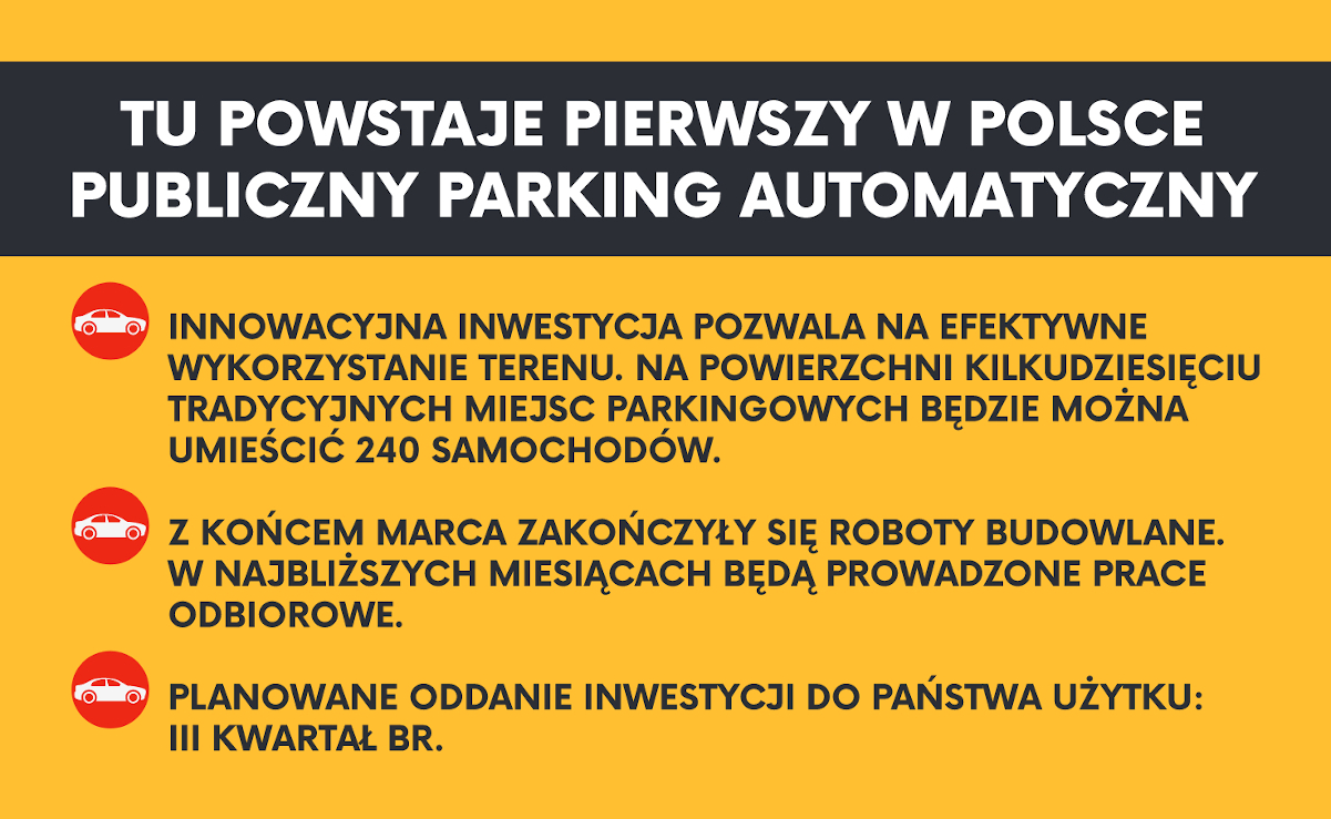 Parking automatyczny przy ulicy Tylnej Mariackiej to pierwsza tego typu inwestycja publiczna w Polsce. Na powierzchni, gdzie zmieściłoby się nieco ponad 40 standardowych miejsc parkingowych, dzięki inwestycji będzie można pozostawić 240 pojazdów. Tym samym Katowice stają się pionierem zastosowania innowacyjnych rozwiązań pozwalających na maksymalnie efektywne zagospodarowanie niedużej przestrzeni w mieście o gęstej zabudowie. W ostatnim czasie montowane były m.in. urządzenia systemu kasowego, automatyki i sterowania czy też prowadzone były prace przy zagospodarowaniu terenu. Teraz wykonawca zgłosił zakończenie prac budowlanych.