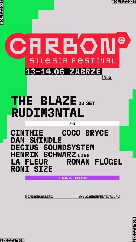 CARBON Silesia Festival to jedno z najbardziej dynamicznych wydarzeń na polskiej mapie muzycznych doznań. Obecna, piąta już edycja przyciąga uwagę imponującym line up’em – na głównych scenach pojawią się Rudimental – brytyjscy królowie drum and bass oraz The Blaze – francuski duet redefiniujący elektroniczne emocje i hipnotyzujące audiowizualne show. Oba zespoły nie tylko reprezentują najwyższy światowy poziom, ale też stanowią wyraźny sygnał – CARBON otwiera sezon z przytupem!
