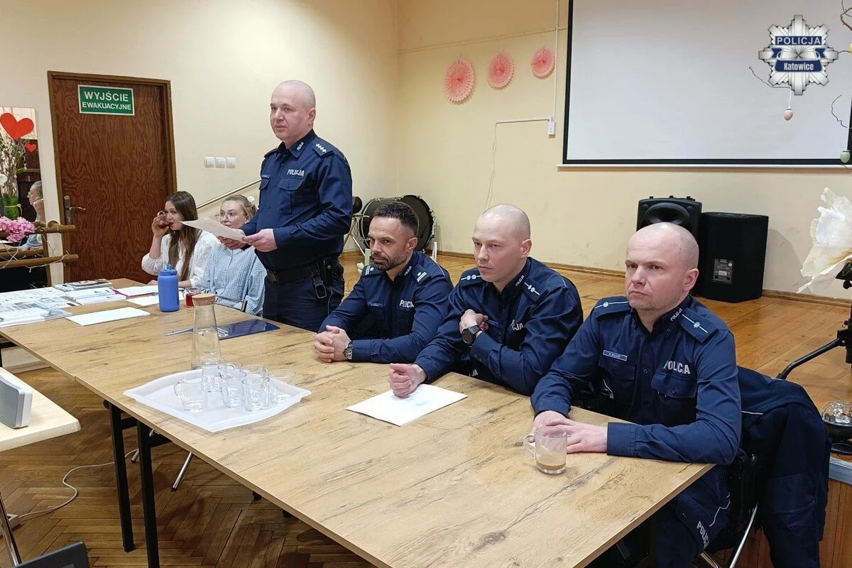 Podczas spotkania poruszono także kwestie związane z codziennym bezpieczeństwem – zarówno w miejscu zamieszkania, jak i w przestrzeni publicznej. Policjantka Referatu ds. Profilaktyki Społecznej, Nieletnich i Patologii KMP w Katowicach st. asp. Agnieszka Krzysztofik omówiła zagrożenia związane z oszustwami „na fałszywego policjanta” oraz „na wnuczka”, wskazując sposoby ich unikania w ramach kampanii „#ZnamTeNumery”.