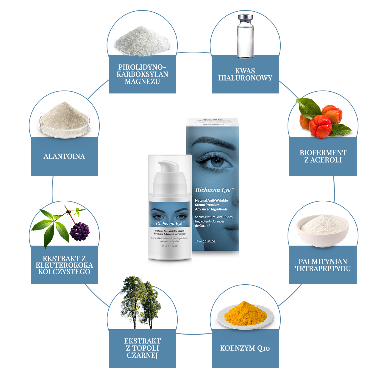Kofeina – zwalcza cienie, likwiduje worki pod oczami, napina skórę, najwięcej jej w ekstrakcie z guarany. Kwas hialuronowy – zwiększa nawilżenie skóry. Koenzym Q10 – pobudza procesy naprawcze skóry i chroni przed wolnymi rodnikami. Bioferment z aceroli – regeneruje i nawilża. Ekstrakt z topoli czarnej – odżywia skórę i wzmacnia naczynia krwionośne. Ekstrakt z lawendy wąskolistnej – spłyca zmarszczki i poprawia nawilżenie skóry. Tak zróżnicowane połączenie składników aktywnych (jak w Richevon Eye) to przepis na sukces.