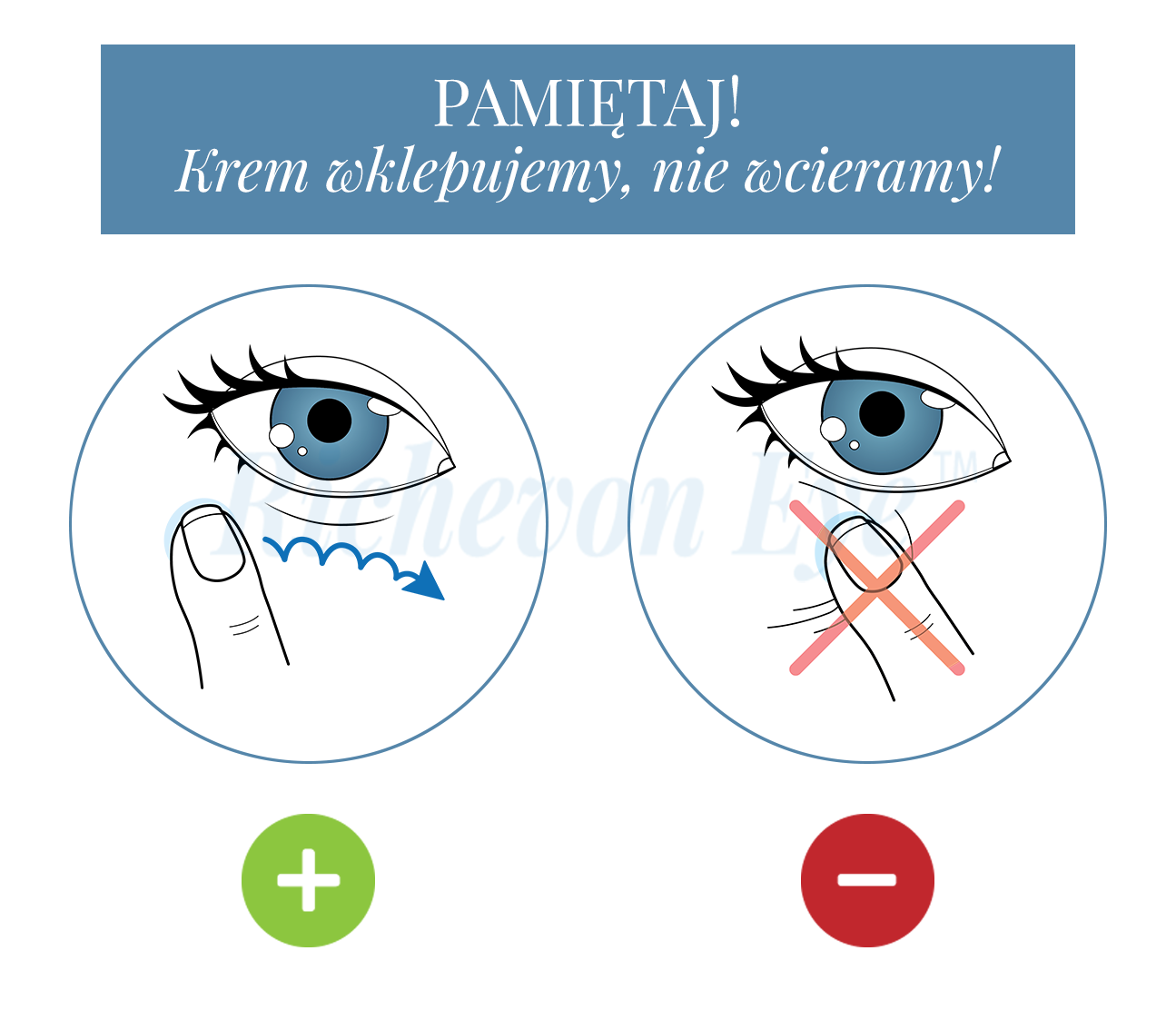 Priorytetem jest dokładne oczyszczenie skóry przed nałożeniem na nią kremu pod oczy. Aplikując krem pod oczy, pamiętajmy też, by go wklepywać, nigdy nie wcierać, ponieważ w ten sposób można rozciągnąć delikatną skórę.
