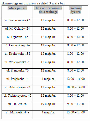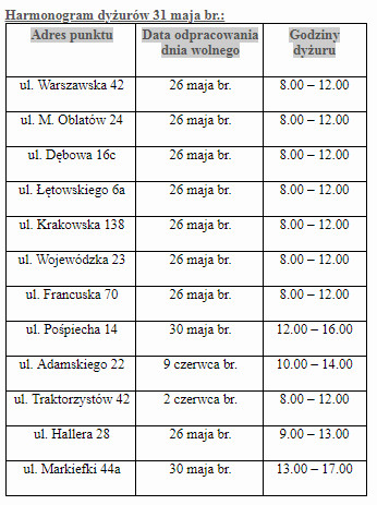 Powyższe wynika z odpracowania dni świątecznych (tj. 1, 3 oraz 31 maja br.).