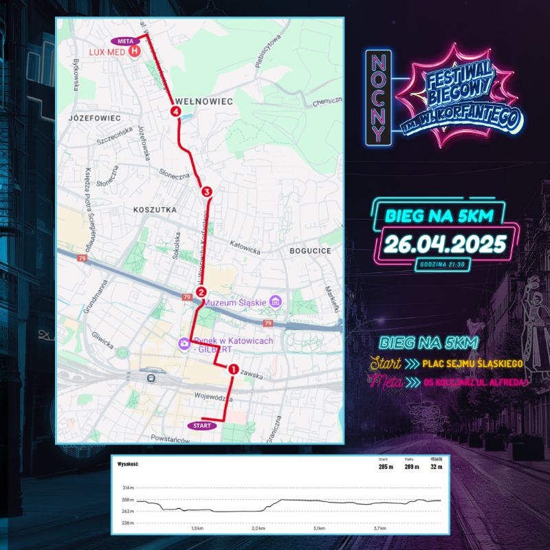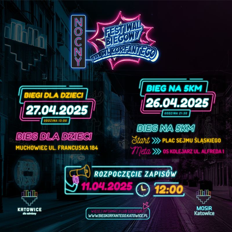 Tegoroczna edycja wydarzenia zaskoczy nową formułą – nocny bieg na dystansie 5 km odbędzie sięw wyjątkowej oprawie Katowickiego Szlaku Neonów. Start już w sobotę o 21:30 z placu Sejmu Śląskiego, a meta znajdzie się przy Ośrodku Sportowym „Kolejarz”.