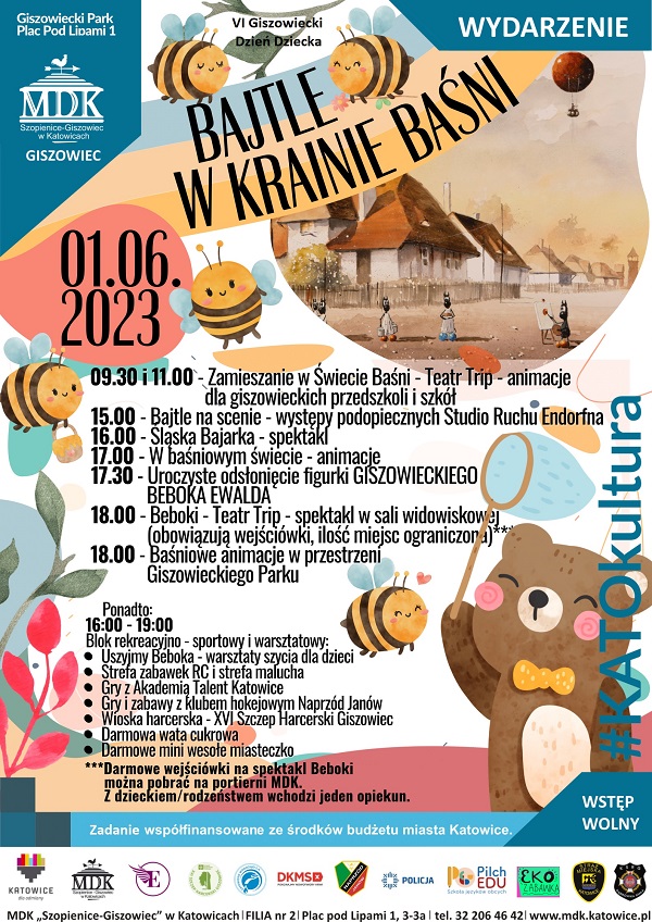 Bajtle w krainie baśni, czyli Giszowiecki Dzień Dziecka organizowany jest 01.06. przez Miejski Dom Kultury w Giszowcu (filia nr 2). Wydarzenie rozpocznie się o godzinie 15:15, a jego zakończenie przewidziane jest na godzinę 19:00. Dodatkowo o godzinie 9:30 oraz 11:00 odbędą się animacje dedykowane giszowieckim przedszkolom i szkołom.