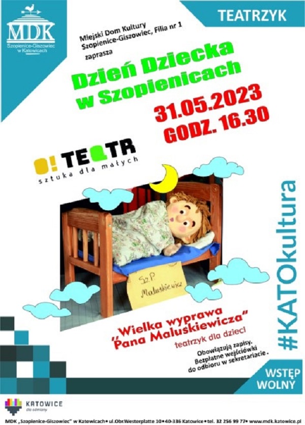 Z okazji Dnia Dziecka w Miejskim Domu Kultury w Szopienicach (filia nr 1) o godzinie 16:30 odbędzie się spektakl teatralny „Wielka wyprawa pana Maluśkiewicza”. Przedstawienie zostanie zorganizowane przez grupę O! Teatr, która będzie towarzyszyć uczestnikom wydarzenia w podróży śladami tytułowego bohatera. Wstęp jest bezpłatny, a darmowe wejściówki można odebrać w sekretariacie MDK Szopienice.