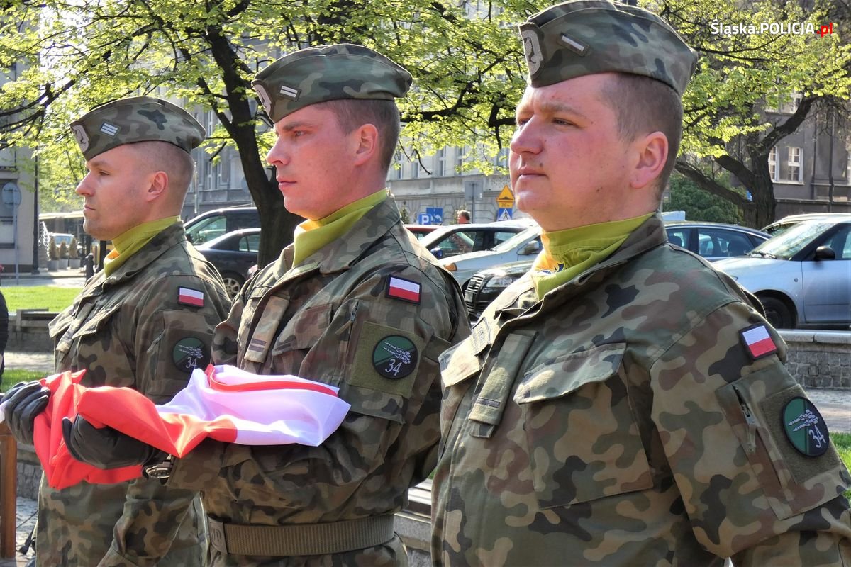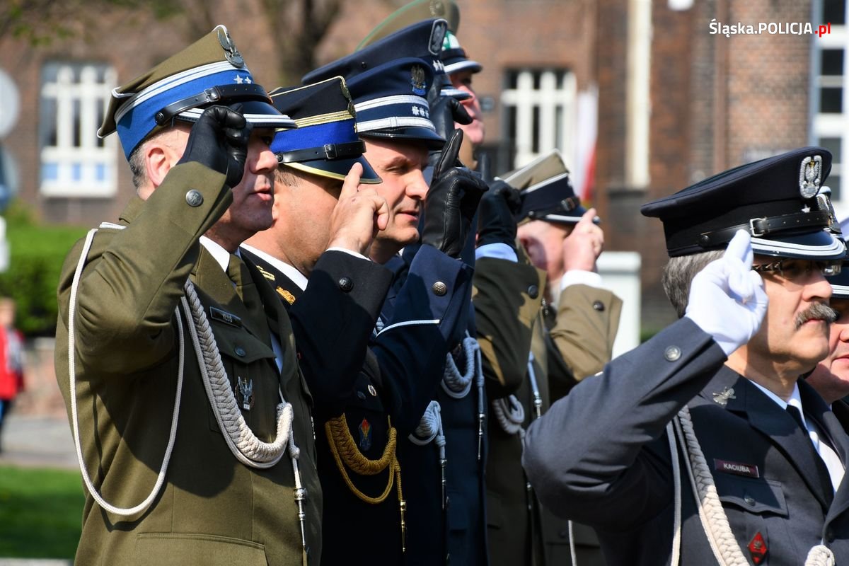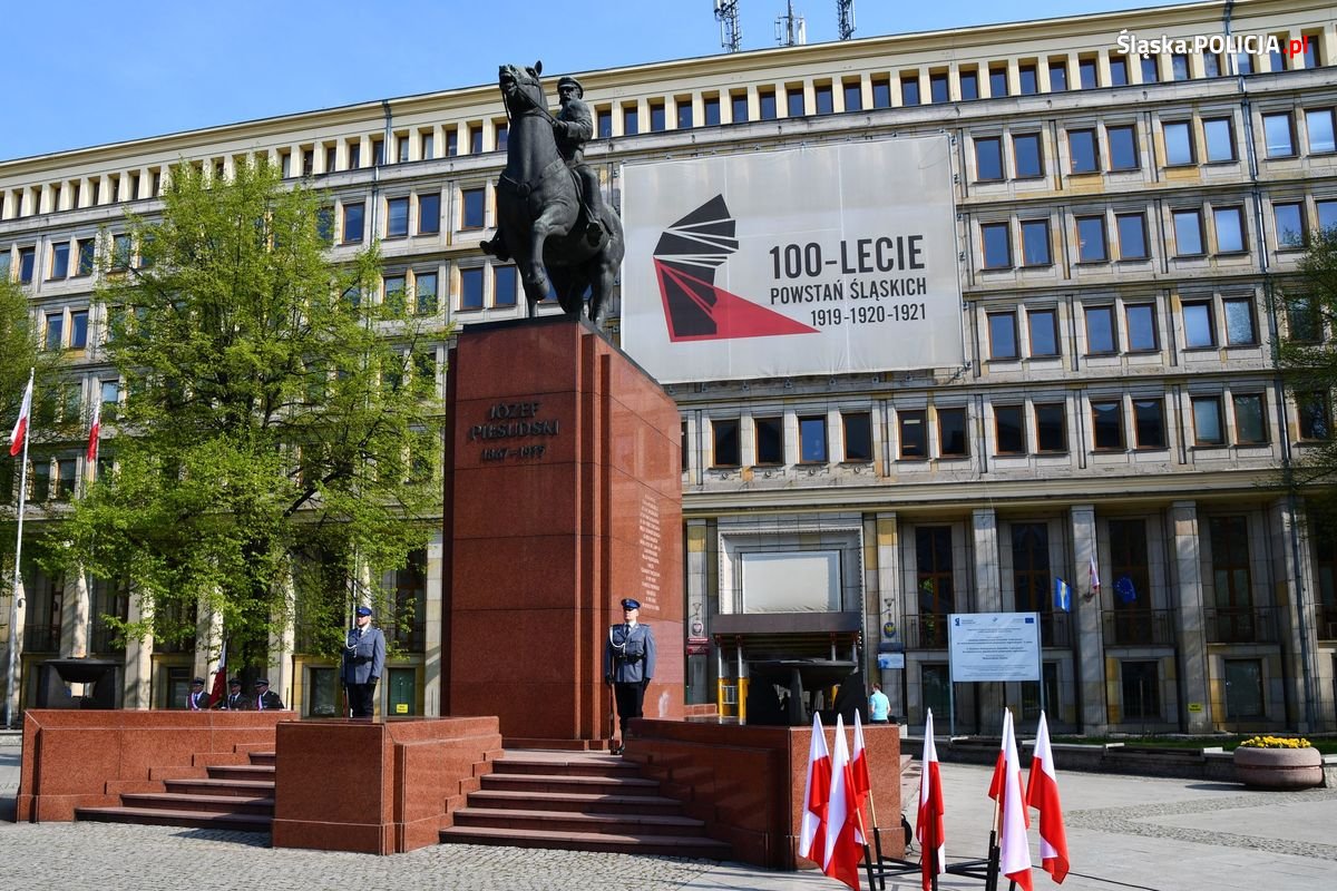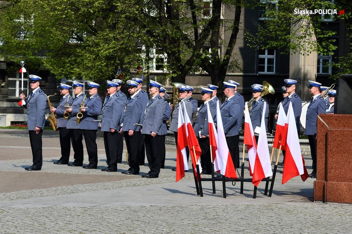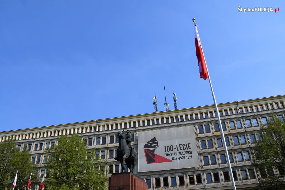 Dzisiaj na placu Bolesława Chrobrego w Katowicach obchodzono Dzień Flagi Rzeczypospolitej Polskiej. W uroczystości uczestniczyło Kierownictwo Śląskiego Urzędu Wojewódzkiego w Katowicach, Urzędu Marszałkowskiego Województwa Śląskiego oraz Zastępca Komendanta Wojewódzkiego Policji w Katowicach insp. Artur Bednarek, a także przedstawiciele innych służb mundurowych. Przy dźwiękach hymnu państwowego, odegranego przez Orkiestrę Komendy Wojewódzkiej Policji w Katowicach oraz w asyście kompanii honorowej, na maszt wciągnięto biało-czerwoną flagę.