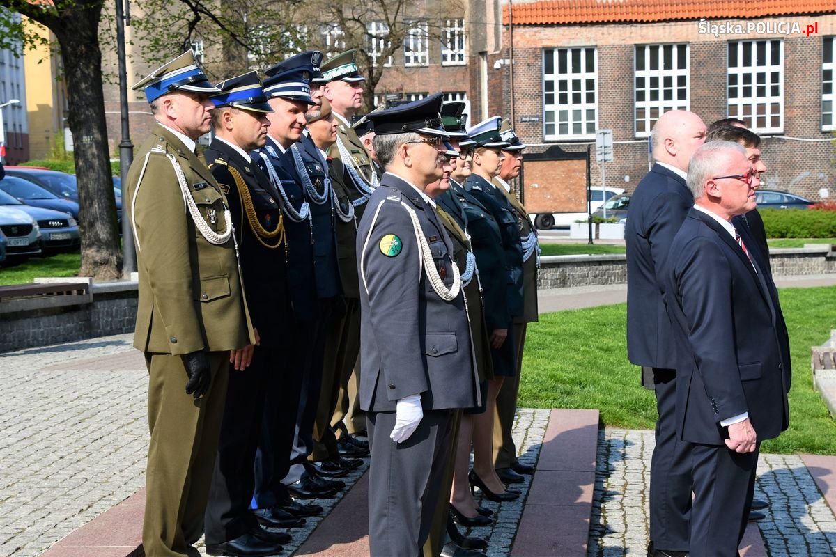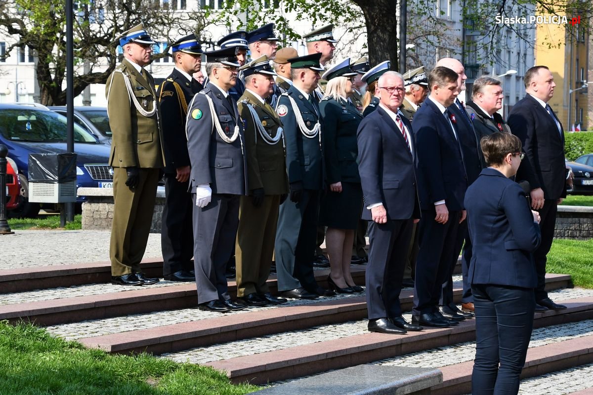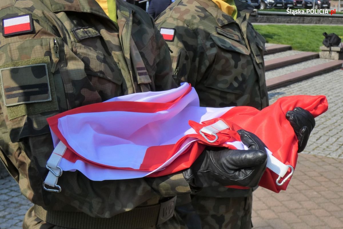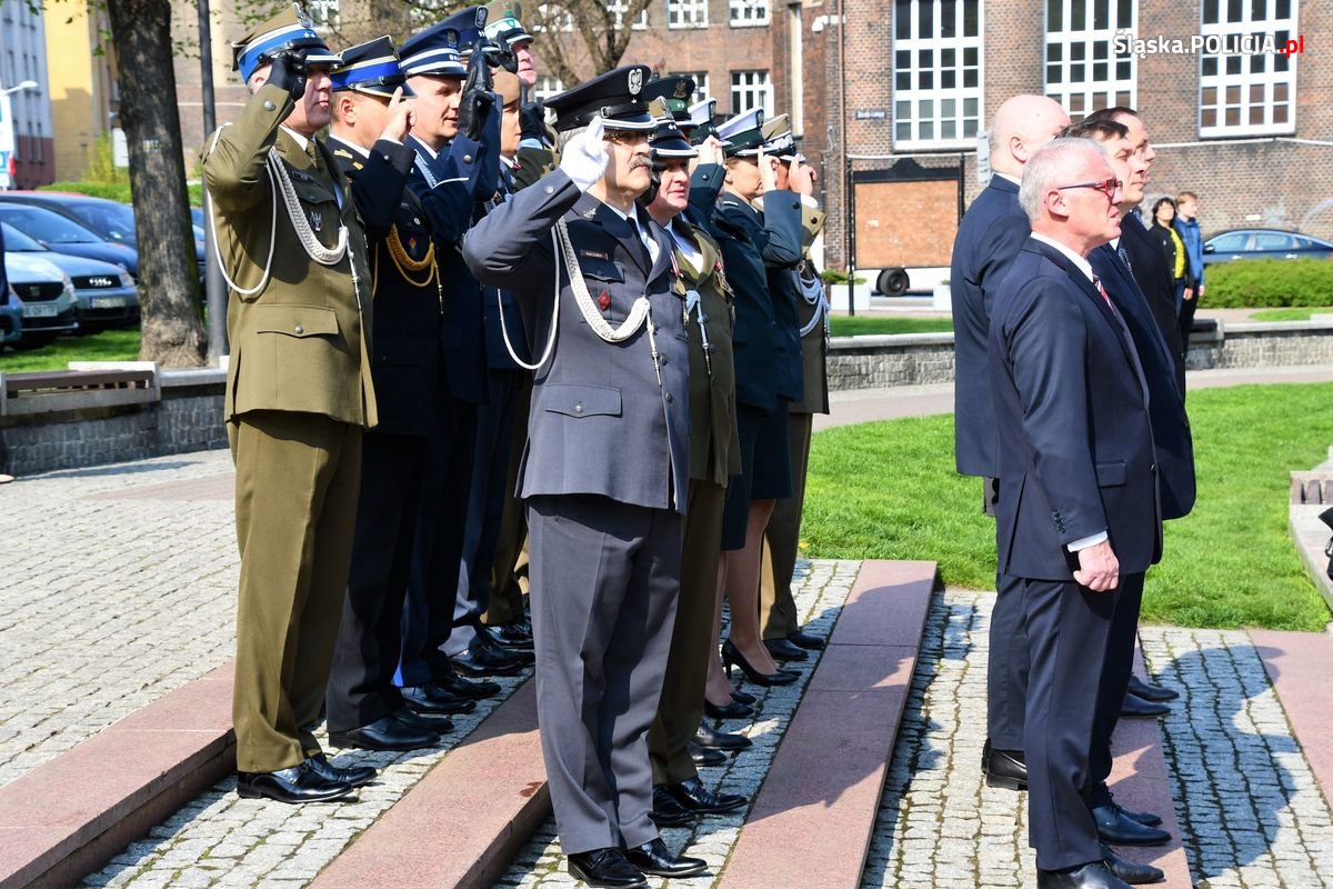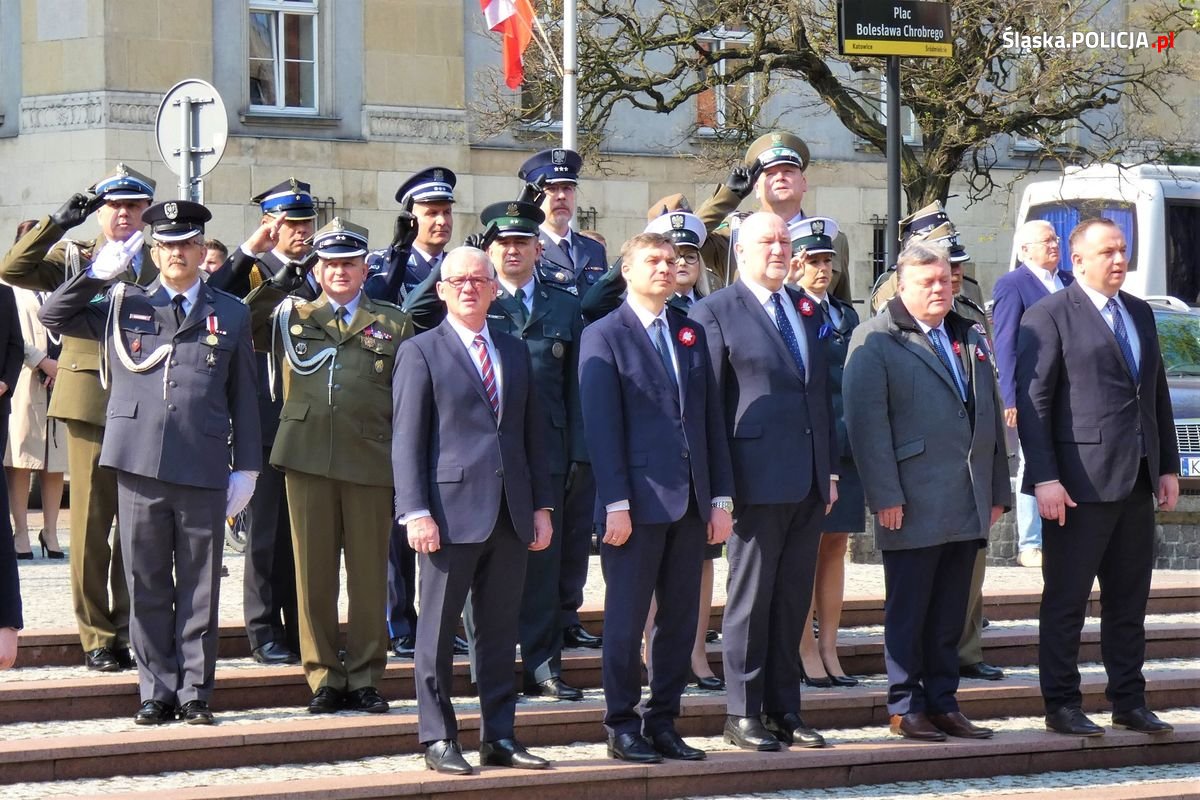 Dzisiaj na placu Bolesława Chrobrego w Katowicach obchodzono Dzień Flagi Rzeczypospolitej Polskiej. W uroczystości uczestniczyło Kierownictwo Śląskiego Urzędu Wojewódzkiego w Katowicach, Urzędu Marszałkowskiego Województwa Śląskiego oraz Zastępca Komendanta Wojewódzkiego Policji w Katowicach insp. Artur Bednarek, a także przedstawiciele innych służb mundurowych. Przy dźwiękach hymnu państwowego, odegranego przez Orkiestrę Komendy Wojewódzkiej Policji w Katowicach oraz w asyście kompanii honorowej, na maszt wciągnięto biało-czerwoną flagę.