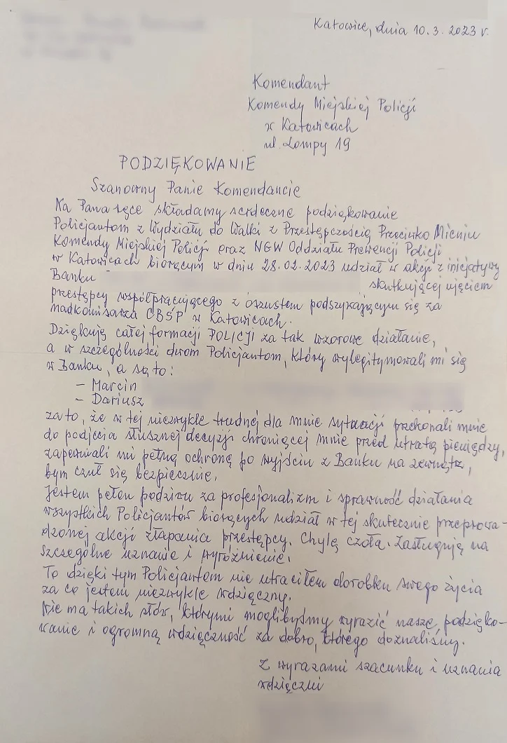 Na ręce Komendanta Miejskiego Policji w Katowicach wpłynęły podziękowania dla policjantów Wydziału do Walki z Przestępczością Przeciwko Mieniu Komendy Miejskiej Policji w Katowicach i NGW Oddziału Prewencji Policji w Katowicach, którzy zatrzymali fałszywego policjanta. Po zanonimizowaniu danych publikujemy ich treść.