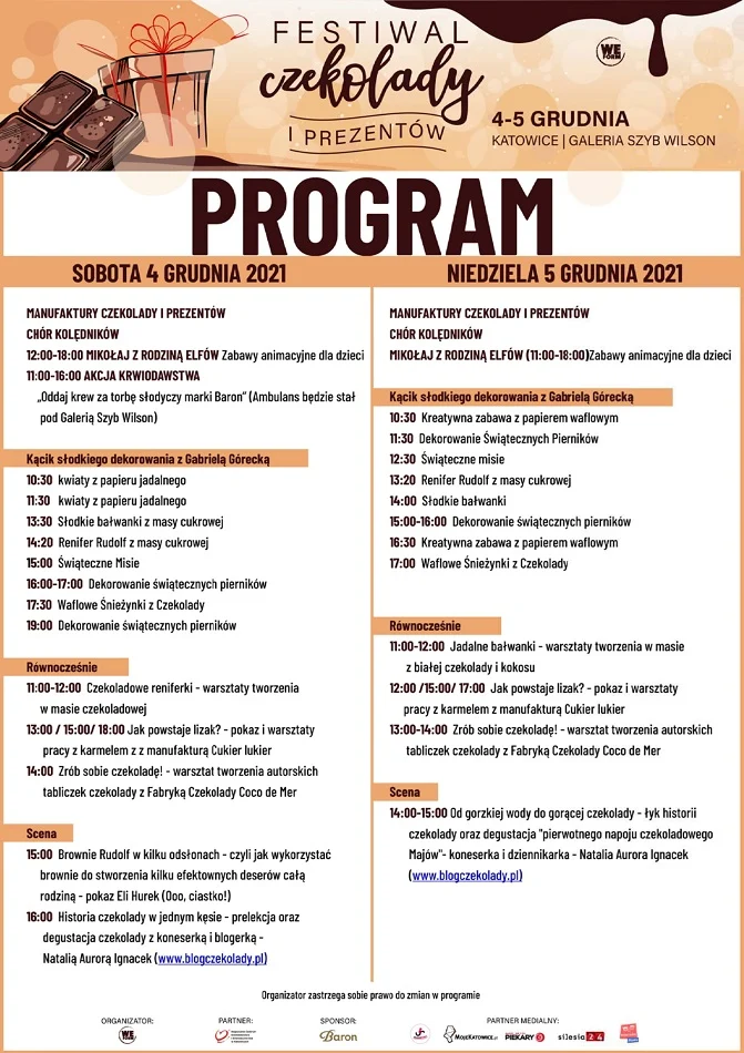 Nie zabraknie atrakcji dla dzieci – Mikołaja z rodziną elfów, czekoladowego kina oraz kreatywnych CZEKO warsztatów. Jesteś fanem czekolady? Chcesz przeżyć z nami magię Świąt w wyjątkowo słodkim klimacie? Organizator zaprasza zatem na najpiękniejszy Czekoladowy Festiwal w Polsce, na jakim jeszcze nie byleś!