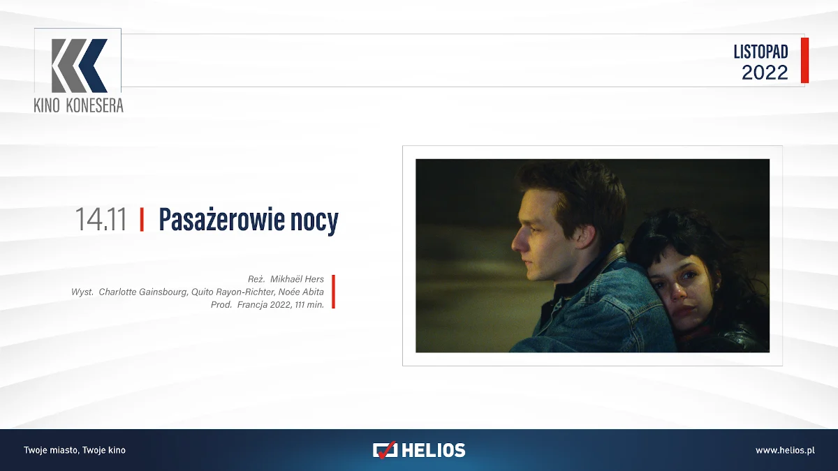 14 listopada w Kinie Konesera zaprezentowany zostanie francuski dramat „Pasażerowie nocy”. W noc wyborczą 1981 roku na ulice Paryża wychodzą zwolennicy nowego prezydenta. W tym samym czasie Elisabeth po odejściu męża zostaje sama z dwójką dzieci. Znajduje pracę w audycji radiowej i poznaje tam Talulah, bezdomną nastolatkę, którą zaprasza do swojego domu. Dzięki niej Talulah po raz pierwszy doświadcza rodzinnego ciepła i opieki. Wkrótce dziewczyna znika, lecz jej potrzeba wolności, wpłynie na życie Elisabeth i jej bliskich, którzy nabiorą pewności siebie i podejmą ryzyko, zmieniające bieg ich życia.