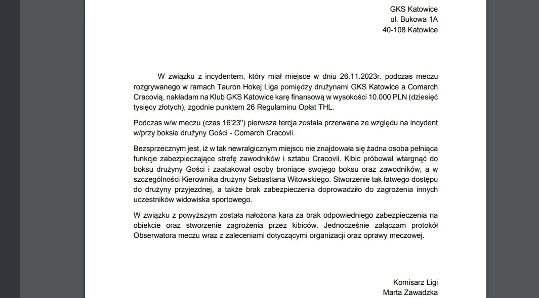 W związku z incydentem, który miał miejsce w dniu 26.11.2023 r. podczas meczu rozgrywanego w ramach Tauron Hokej Liga pomiędzy drużynami GKS Katowice a Comarch Cracovią, nakładam na Klub GKS Katowice karę finansową w wysokości 10.000 PLN (dziesięć tysięcy złotych), zgodnie punktem 26 Regulaminu Opłat THL.