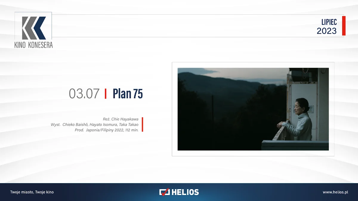 W poniedziałek, 3 lipca w ramach cyklu Kino Konesera zaprezentowany zostanie film „Plan 75”. Japonia to kraj słynący z rozwiniętej technologii oraz doskonałej opieki medycznej, które przekładają się na wysoką średnią życia jej obywateli. W połączeniu z niskim współczynnikiem dzietności stanowi to jednak dla rządu sygnał alarmowy. Starzejące się społeczeństwo jest zapowiedzią kryzysu ekonomicznego oraz zaburzenia równowagi państwa. Rozwiązaniem ma być rządowy program kryjący się pod nazwą Plan 75. Zachęca on do eutanazji osoby, które ukończyły siedemdziesiąty piąty rok życia. Obecne na każdym kroku reklamy, adresowane do zdezorientowanych seniorów, zachwalają korzyści, jakie płyną z rewolucyjnego programu. Jednym z argumentów ma być wynagrodzenie, które balansującym na granicy ubóstwa uczestnikom Planu pozwoli zrealizować ostatnie marzenie…