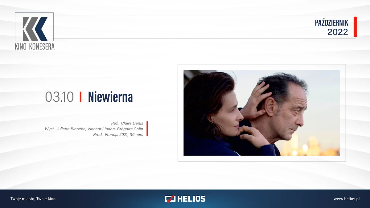 3 października w Kinie Konesera zaprezentowany zostanie zdobywca Srebrnego Niedźwiedzia w Berlinie – film „Niewierna” z Juliette Binoche w tytułowej roli. Sara i Jean od kilku lat są w szczęśliwym związku. Łączy ich silne uczucie i niegasnące pożądanie. Pewnego dnia Sara przypadkowo spotyka na ulicy François, swojego dawnego partnera i przyjaciela Jeana. Wkrótce potem François proponuje Jeanowi wspólną pracę, a sytuacja między nimi zaczyna wymykać się spod kontroli.