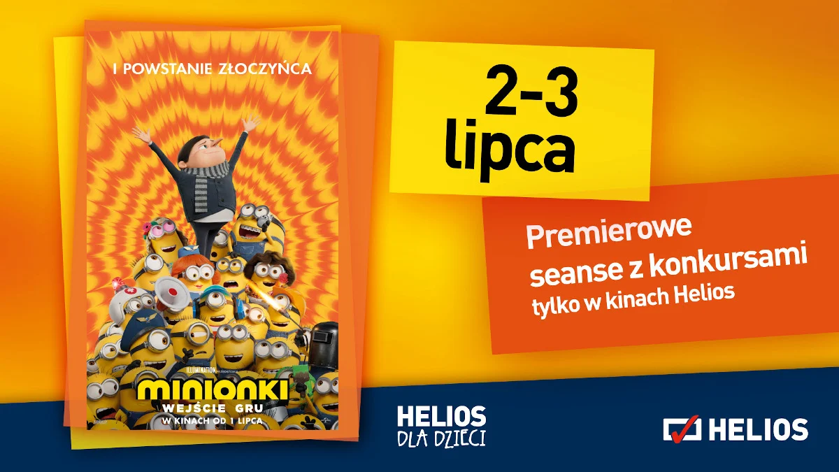 Światowy fenomen pop kulturypowraca w zupełnie nowej odsłonie. Już 1 lipca Minionki zaatakują ekrany kin Helios! Te małe „czarne charakterki” o złotych sercach, pokochali mali i duzi kinomani. W komedii „Minionki: Wejście Gru” widzowie poznają nieopowiedzianą dotąd historię pewnego dwunastolatka, którymarzy tylko o jednym – by stać się największym złoczyńcą świata. Jest chłopcem mieszkającym na przedmieściach, pracującym w swojej piwnicy nad planem przejęcia władzy nad światem. Długo jednak nie odnosi żadnego znaczącego sukcesu. Kiedy spotyka Minionki, łączy z nimi swoje siły. Razem budują pierwszą kryjówkę, projektują niezwykłą broń i w końcu wykonują pierwsze misje… Podczas premierowego weekendu (2 i 3 lipca, w wybranych godzinach) Helios organizuje także wyjątkowe seanse z animacjami. Na widzów czekać będą quizy i zagadki do rozwiązania, a na każdego małego kinomana czekać będzie minionkowa niespodzianka!