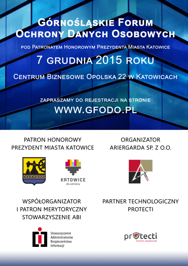7 grudnia 2015 roku w Katowicach odbędzie się pierwsze, z kilkunastu planowanych wydarzeń składających się na cykl Forum Ochrony Danych Osobowych. Organizatorami Górnośląskiego Forum Ochrony Danych Osobowych są Ariergarda Sp. z o.o. oraz Stowarzyszenie Administratorów Bezpieczeństwa Informacji. Autorzy wydarzenia planują w 2016 roku szereg spotkań, których założeniem jest prowadzenie działalności podnoszącej świadomość i wiedzę obecnych i potencjalnych Administratorów Bezpieczeństwa Informacji, Administratorów Danych Osobowych, a także osób zainteresowanych problematyką ochrony danych osobowych. Oprócz Katowic planowane są spotkania w ośrodkach takich jak: Wrocław, Poznań, Kielce, Rzeszów, Trójmiasto, Bydgoszcz, Toruń czy Białystok.