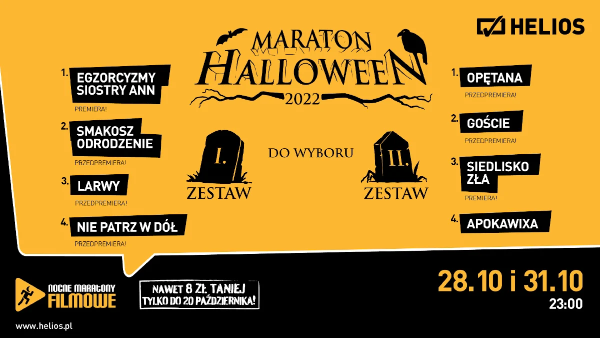 Nocne Maratony Filmowe Helios jak co roku stawiają przed Fanami horrorów nielada dylemat. Do wyboru są dwie noce i dwa zestawy filmów, a w nich aż 8 przerażających horrorów w tym 5 przedpremierowych! 28 i 31 października widzowie mogą wybierać spośród wybranych na tę okazję tytułów. W pierwszym zestawie: “EGZORCYZMY SIOSTRY ANN”, “SMAKOSZ ODRODZENIE”, “LARWY” i “NIE PATRZ w DÓŁ”. Zestaw drugi to również prawdziwa uczta dla miłośników filmów grozy, a wśród nich: “OPĘTANA”, “GOŚCIE”, “SIEDLISKO ZŁA” oraz „APOKAWIXA”. Pewne jest, że taka dawka strachu jeszcze długo po powrocie do domu nie pozwoli zasnąć. Pytanie na który z zestawów wystarczy widzom odwagi?