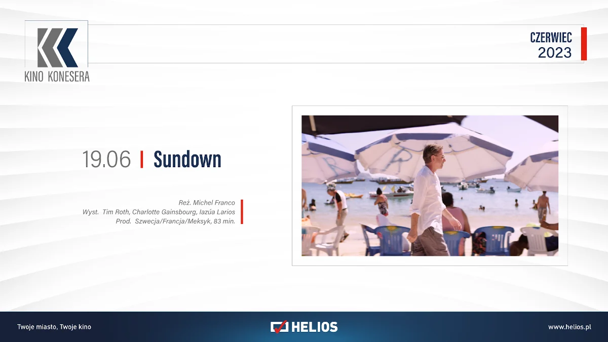 Fani cyklu Kino Konesera będą mogli wybrać się w nadchodzącym tygodniu na poniedziałkowy seans filmu „Sundown”. Rodzeństwo Alice i Neil spędzają urlop w słynnym meksykańskim kurorcie. Sielankę przerywa niespodziewany telefon, który zmusi ich do zmiany planów, a w głowie Neila pojawi się pokusa, by całkowicie zmienić swoje życie… Film stawia najważniejsze pytania o to, co naprawdę czyni nas szczęśliwymi. Pieniądze? Miłość? Więzi? A może ich brak?