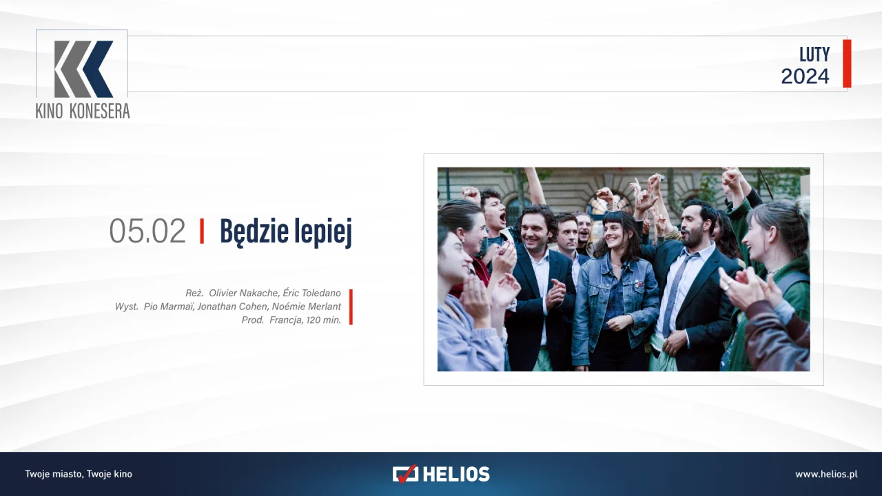 Poniedziałki to dni cyklu Kino Konesera, ukazującego mniej komercyjne produkcje. 5 lutego odbędzie się projekcja francuskiej komedii „Będzie lepiej”, opowiadającej o dwóch zadłużonych mężczyznach, chcących poprawić swoją sytuację materialną. Desperacja sprawia, że dołączają do grupy aktywistów klimatycznych. Tam spotykają kobietę, która zmienia ich podejście do życia.