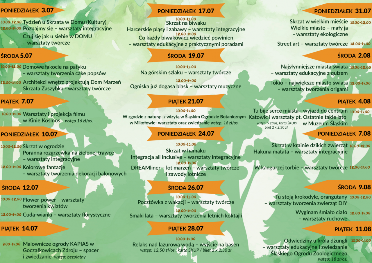 MDK “Koszutka” zaprasza do zapisów na letnią warsztatowo-zajęciowo akcję „Lato w Mieście”. Zajęcia będą odbywać się w dniach od 3 lipca do 11 sierpnia w poniedziałki, środy i piątki w godzinach 10.00-14.00 w Miejskim Domu Kultury “Koszutka” filia “Dąb” w Katowicach, ul. Krzyżowa 1. Wstęp bezpłatny, za wyjątkiem wyjść wedle programu. Poniżej szczegółowy harmonogram zajęć.