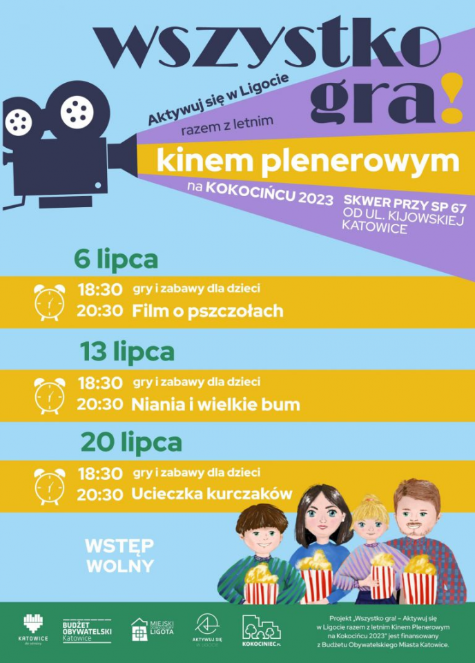 W ramach Budżetu Obywatelskiego Miasta Katowice MDK „Ligota” zaprasza na letnie kino plenerowe na Kokocińcu. Seanse odbędą się w wybranych dniach lipca i sierpnia przy Szkole Podstawowej nr 67. Od godziny 18:30 rozpoczną się gry i zabawy dla dzieci, a od 20:30 pokaz filmu familijnego. Wstęp wolny.