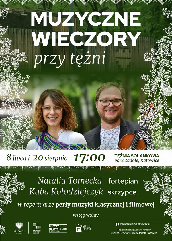 MDK „Ligota” zaprasza 8 lipca i 20 sierpniao godz. 17:00 na koncerty Natalii Tomeckiej i Kuby Kołodziejczyka. Koncerty odbędą się w przestrzeni Tężni Solankowej w parku Zadole. Połączenie zielonej scenerii, zdrowotnych właściwości tężni oraz dźwięków muzyki wykonywanej na żywo to okazja, by miło spędzić ten sobotni wieczór. Program koncertu to wyjątkowa mieszanka najpopularniejszych utworów muzyki klasycznej i filmowej w aranżacji na skrzypce i fortepian. Obok utworów Bacha czy Brahmsa usłyszymy melodie znane ze srebrnego ekranu. Wstęp wolny.