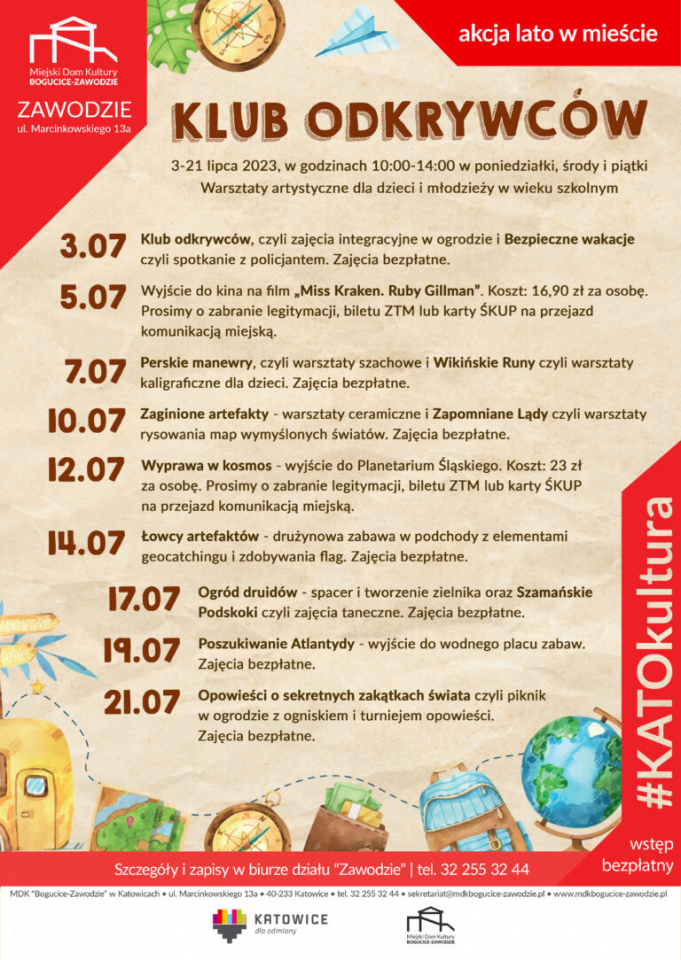 MDK „Bogucice-Zawodzie” dział Zawodzie zaprasza dzieci i młodzież szkolną do Klubu Odkrywcy. W programie m.in. zajęcia integracyjne, piknik, wyjście na wodny plac zabaw, do kina i do Planetarium. Szczegółowy harmonogram na plakacie ponizej.