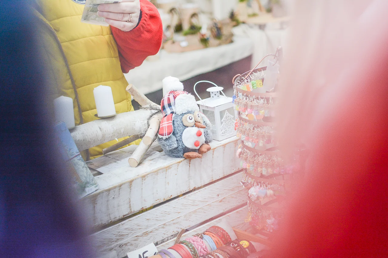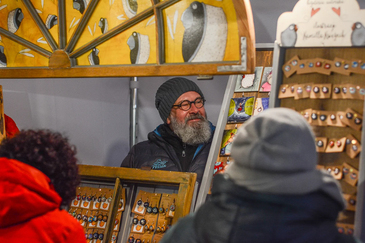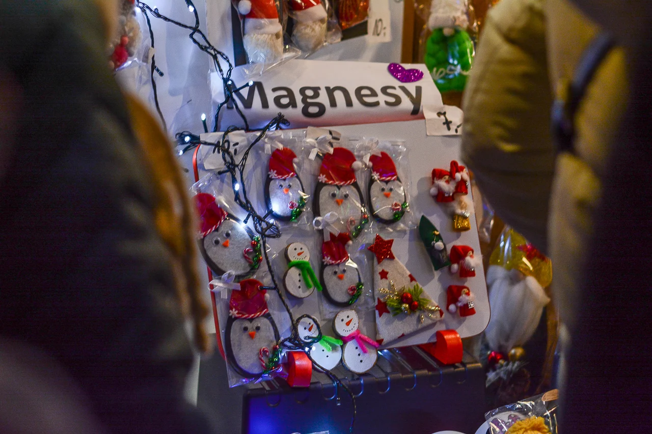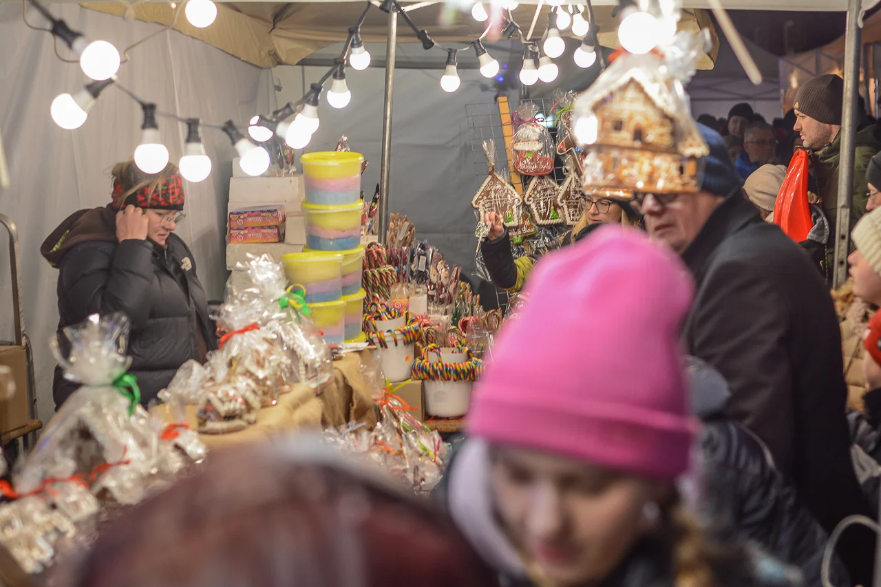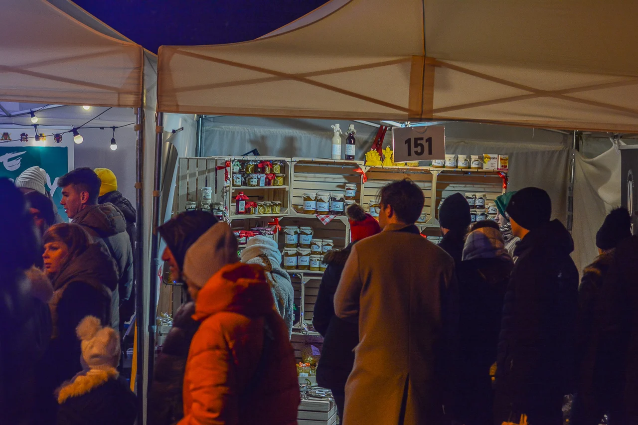 Samych stoisk również było bardzo dużo – od gastronomii (tu wydzielono częściowo osobną strefę), przez przyprawy, słodycze i sery, rękodzieło, obrazy, aż po odpustowe bibeloty (choć tych było, na szczęście, najmniej). Do tego karuzela, miejsca do sesji zdjęciowych, i podświetlane ozdoby świąteczne. Było kolorowo, głośno, a świąteczna muzyka mieszała się z gwarem rozmów i smakowitymi zapachami.