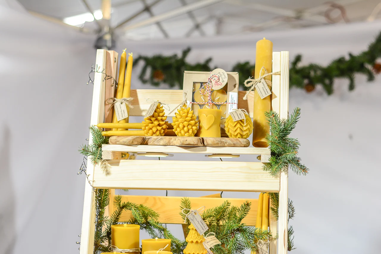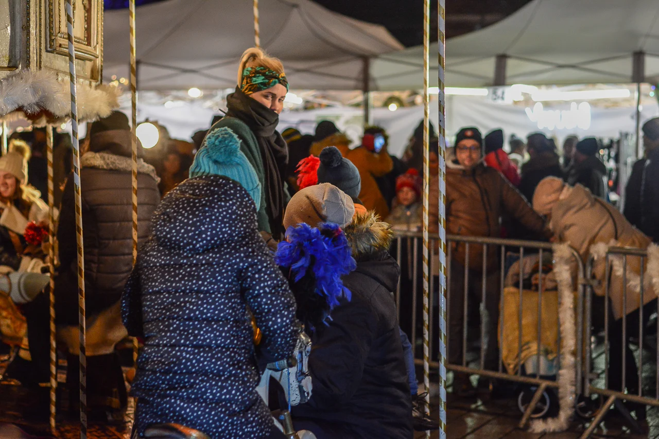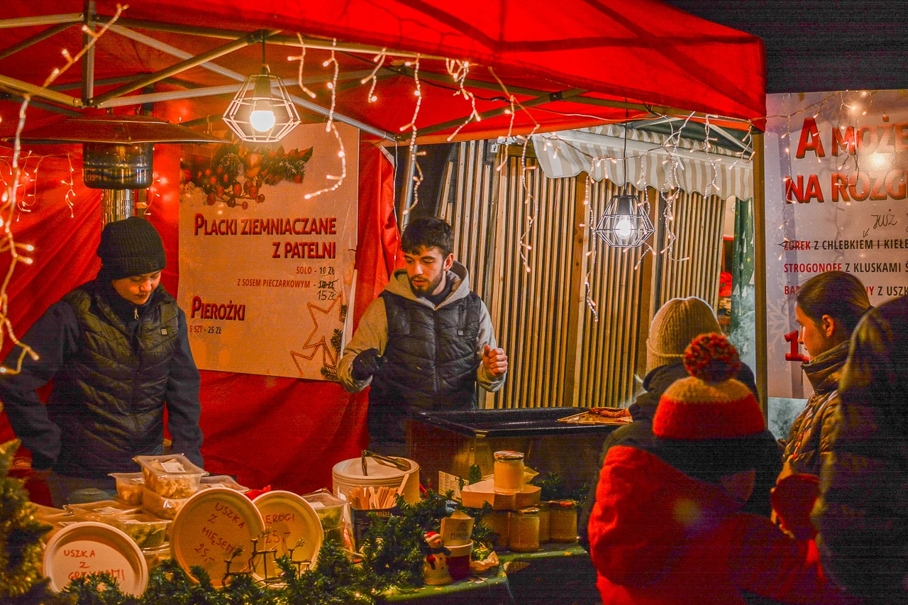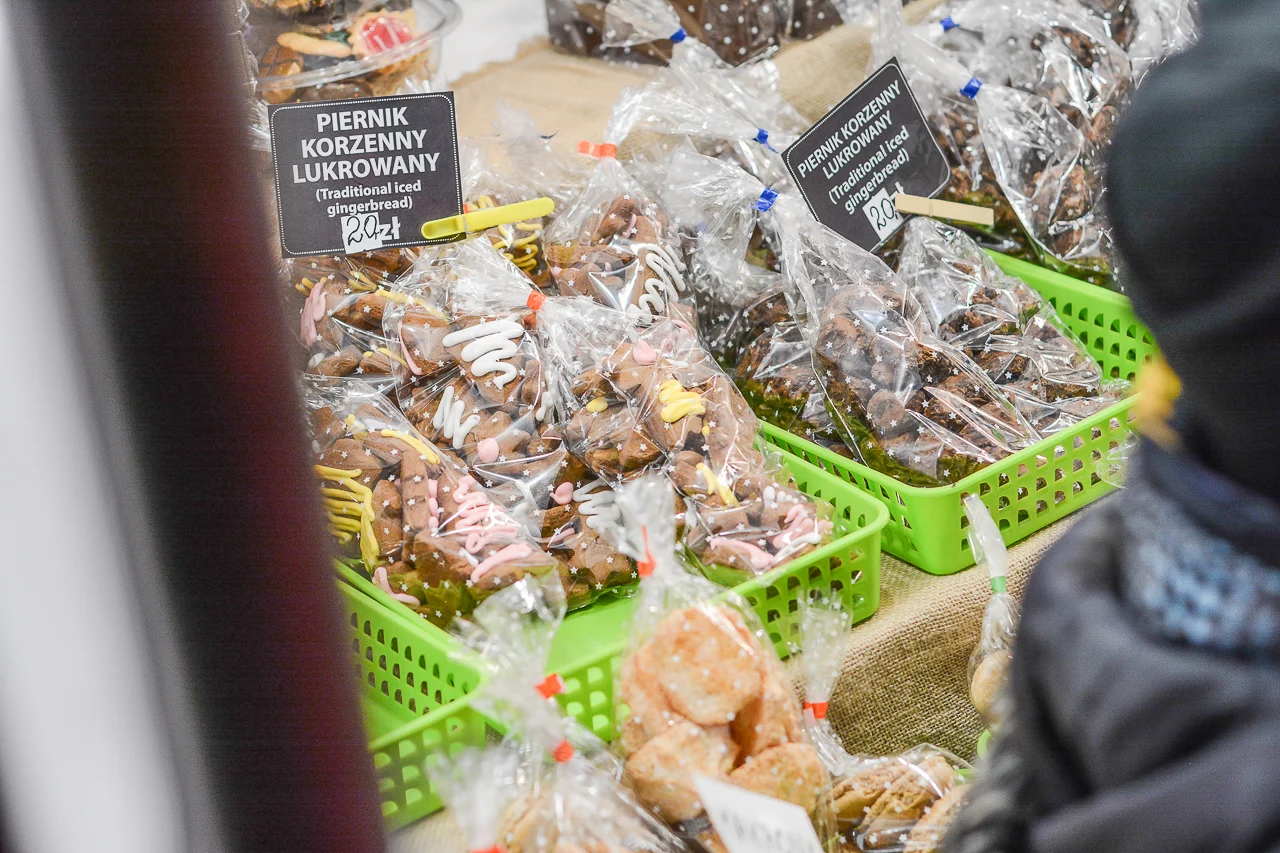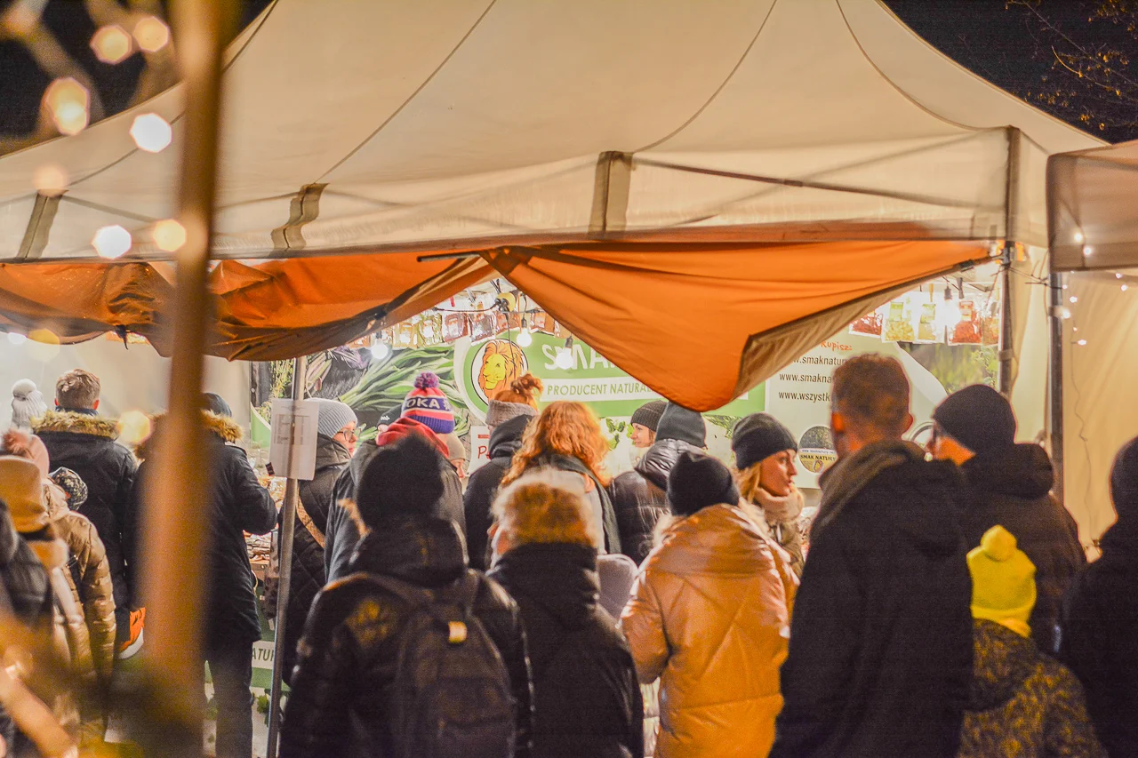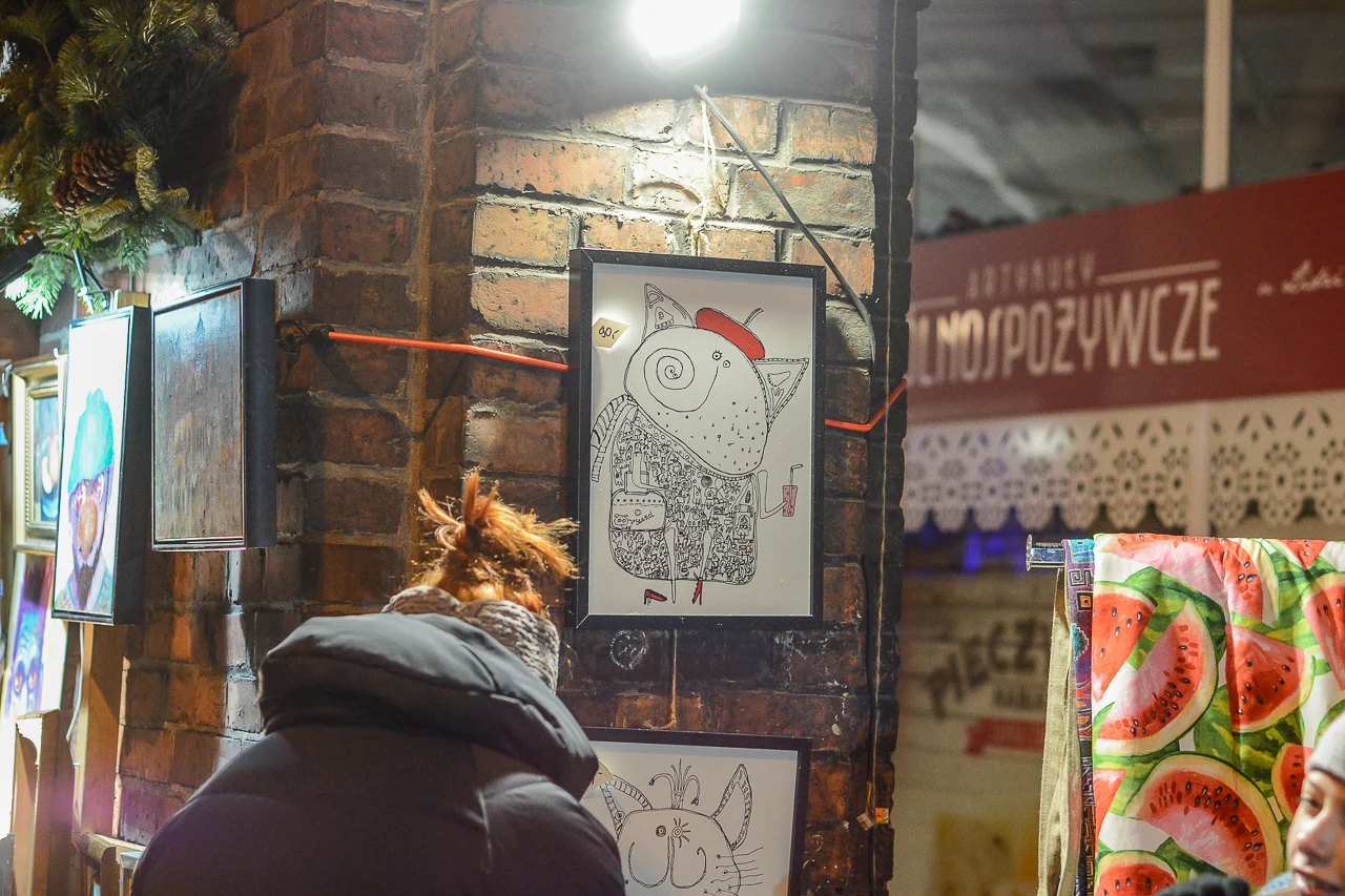 Samych stoisk również było bardzo dużo – od gastronomii (tu wydzielono częściowo osobną strefę), przez przyprawy, słodycze i sery, rękodzieło, obrazy, aż po odpustowe bibeloty (choć tych było, na szczęście, najmniej). Do tego karuzela, miejsca do sesji zdjęciowych, i podświetlane ozdoby świąteczne. Było kolorowo, głośno, a świąteczna muzyka mieszała się z gwarem rozmów i smakowitymi zapachami.
