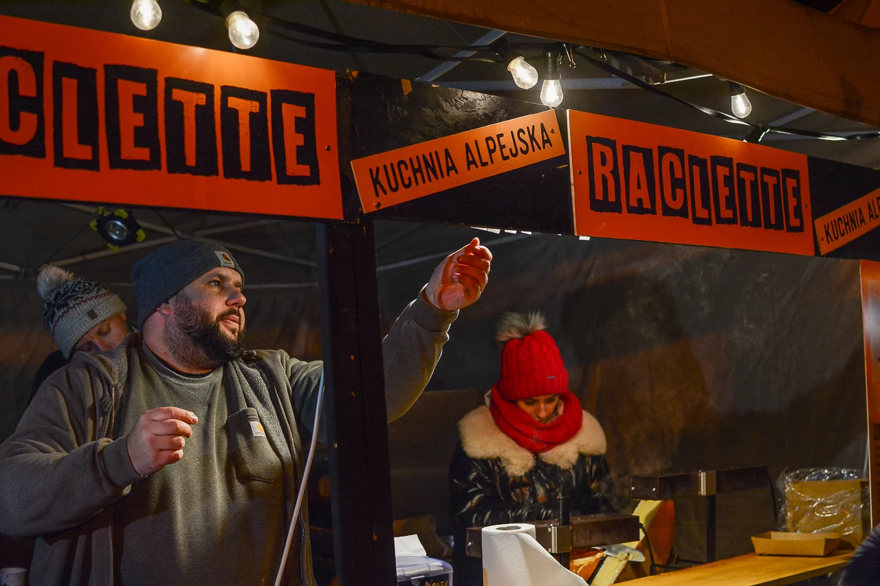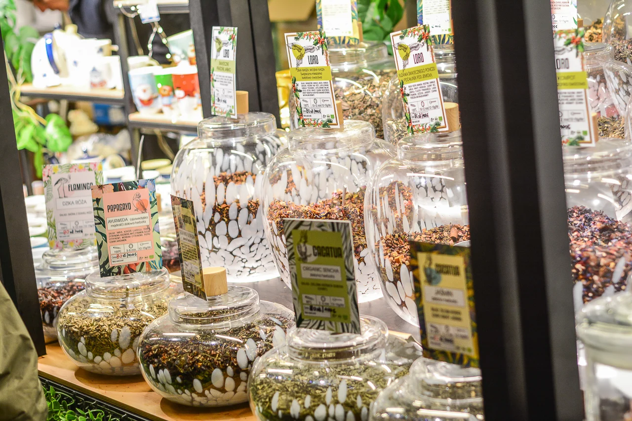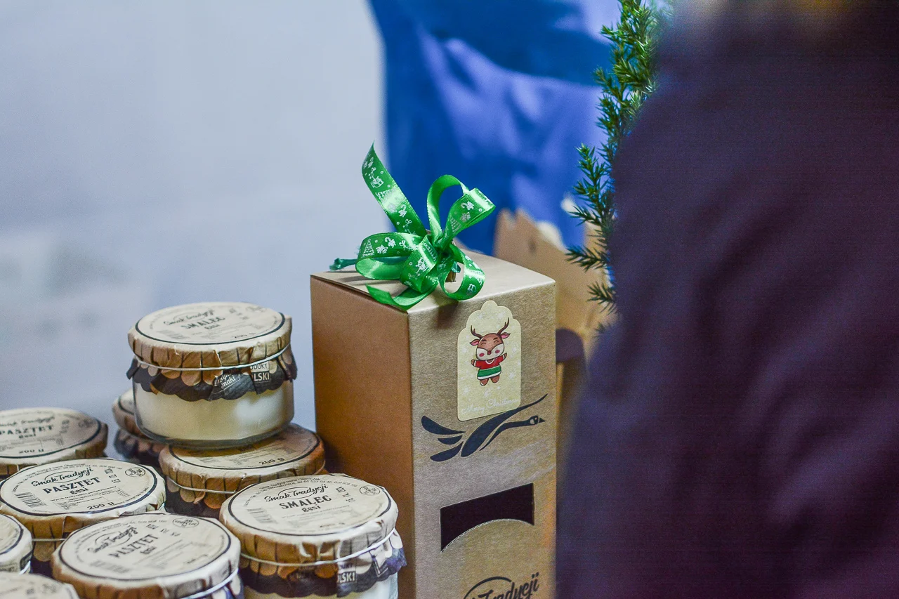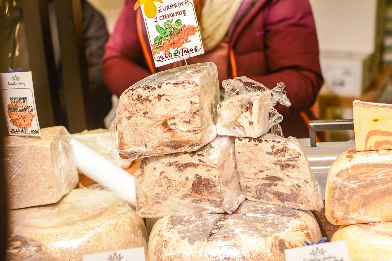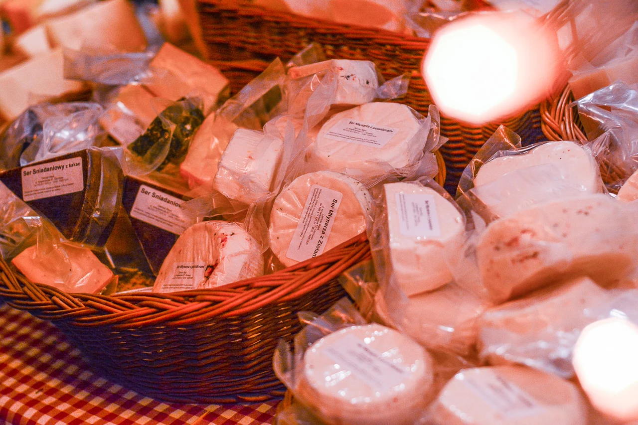 Samych stoisk również było bardzo dużo – od gastronomii (tu wydzielono częściowo osobną strefę), przez przyprawy, słodycze i sery, rękodzieło, obrazy, aż po odpustowe bibeloty (choć tych było, na szczęście, najmniej). Do tego karuzela, miejsca do sesji zdjęciowych, i podświetlane ozdoby świąteczne. Było kolorowo, głośno, a świąteczna muzyka mieszała się z gwarem rozmów i smakowitymi zapachami.