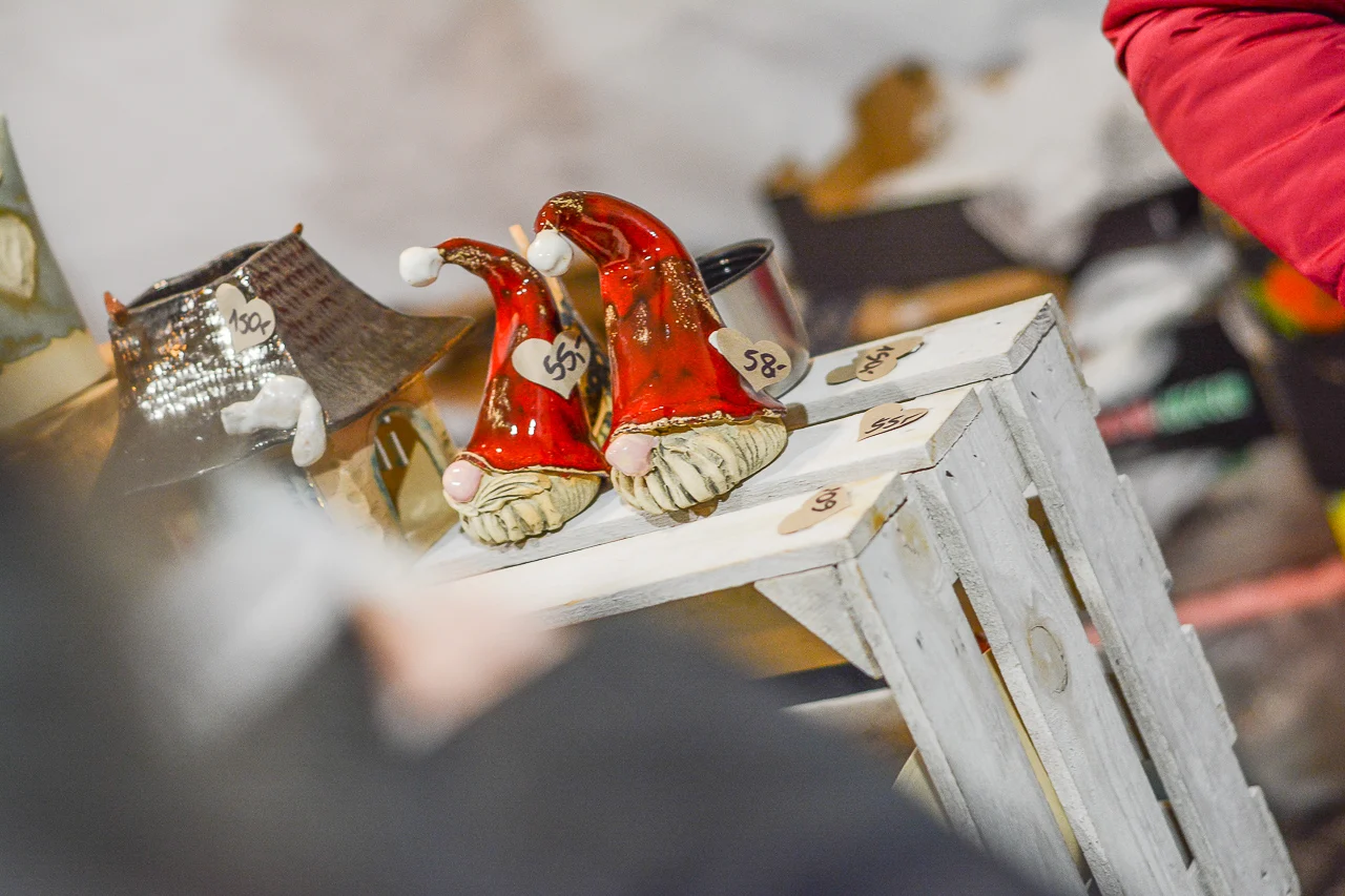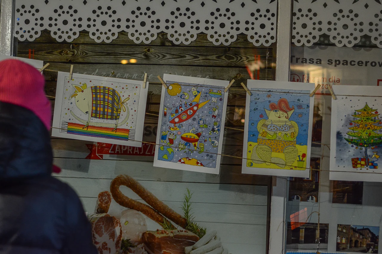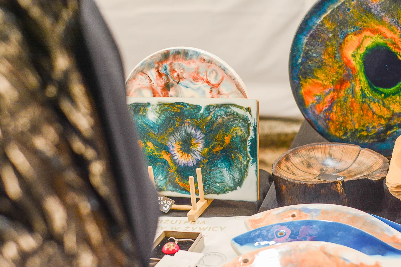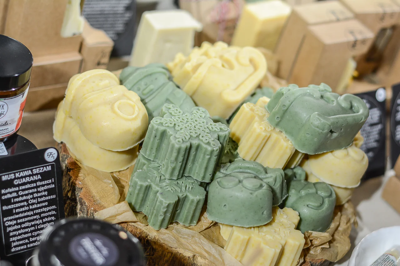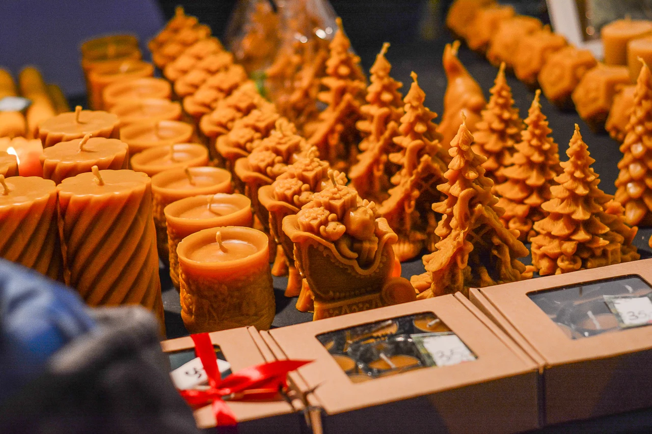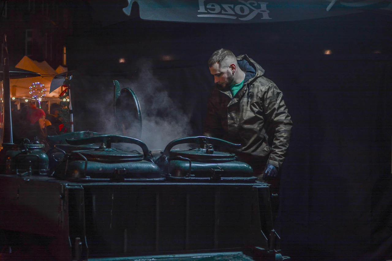 Samych stoisk również było bardzo dużo – od gastronomii (tu wydzielono częściowo osobną strefę), przez przyprawy, słodycze i sery, rękodzieło, obrazy, aż po odpustowe bibeloty (choć tych było, na szczęście, najmniej). Do tego karuzela, miejsca do sesji zdjęciowych, i podświetlane ozdoby świąteczne. Było kolorowo, głośno, a świąteczna muzyka mieszała się z gwarem rozmów i smakowitymi zapachami.