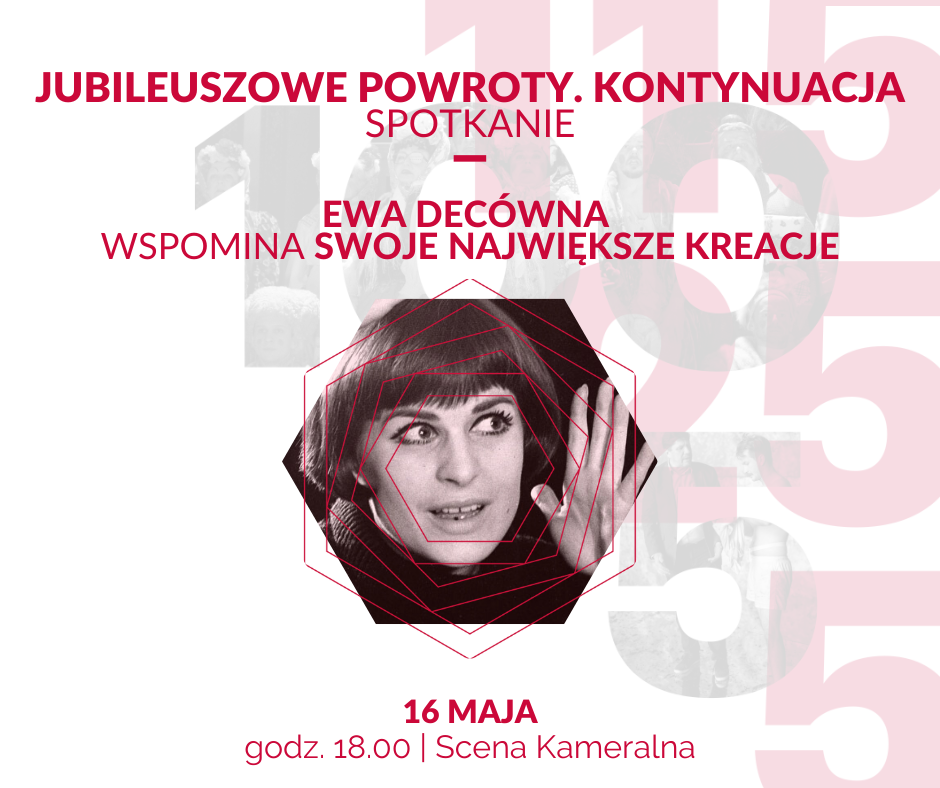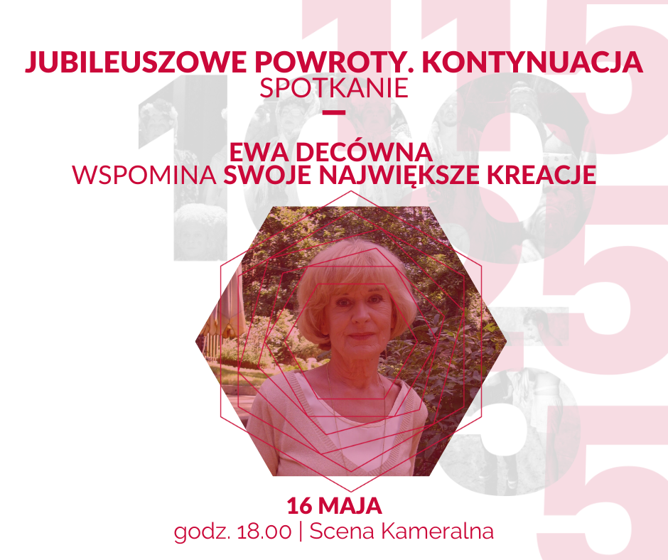 Ewa Decówna będzie gościem najbliższego spotkania z cyklu JUBILEUSZOWE POWROTY. KONTYNUACJA zorganizowanego przez Teatr Śląski im. Stanisława Wyspiańskiego w Katowicach dla uczczenia Roku Jubileuszowego, na który składa się aż 5 jubileuszy: 115 lat teatru,100 lat sceny polskiej, 25 lat Rady Mecenasów Teatru Śląskiego, 5 lat Fundacji Teatru Śląskiego „Wyspiański” oraz 5 lat Międzynarodowego Festiwalu Open the Door.