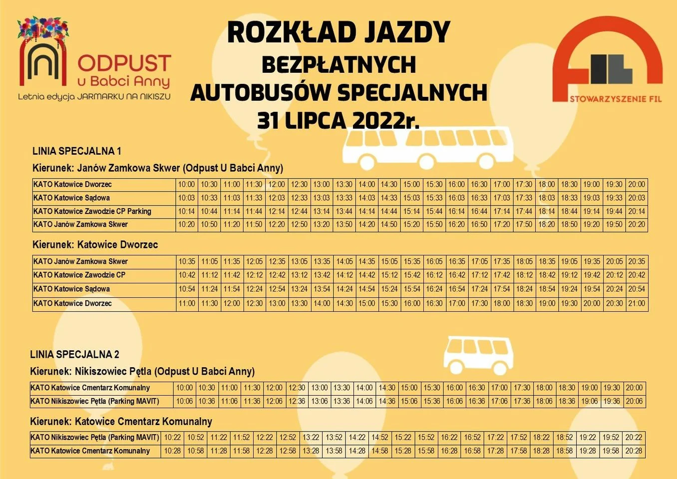- Dworzec w Katowicach – ul. Sądowa – Centrum Przesiadkowe Zawodzie (duży darmowy parking) – Janów Zamkowa Skwer (tuż przy wejściu na Odpust);