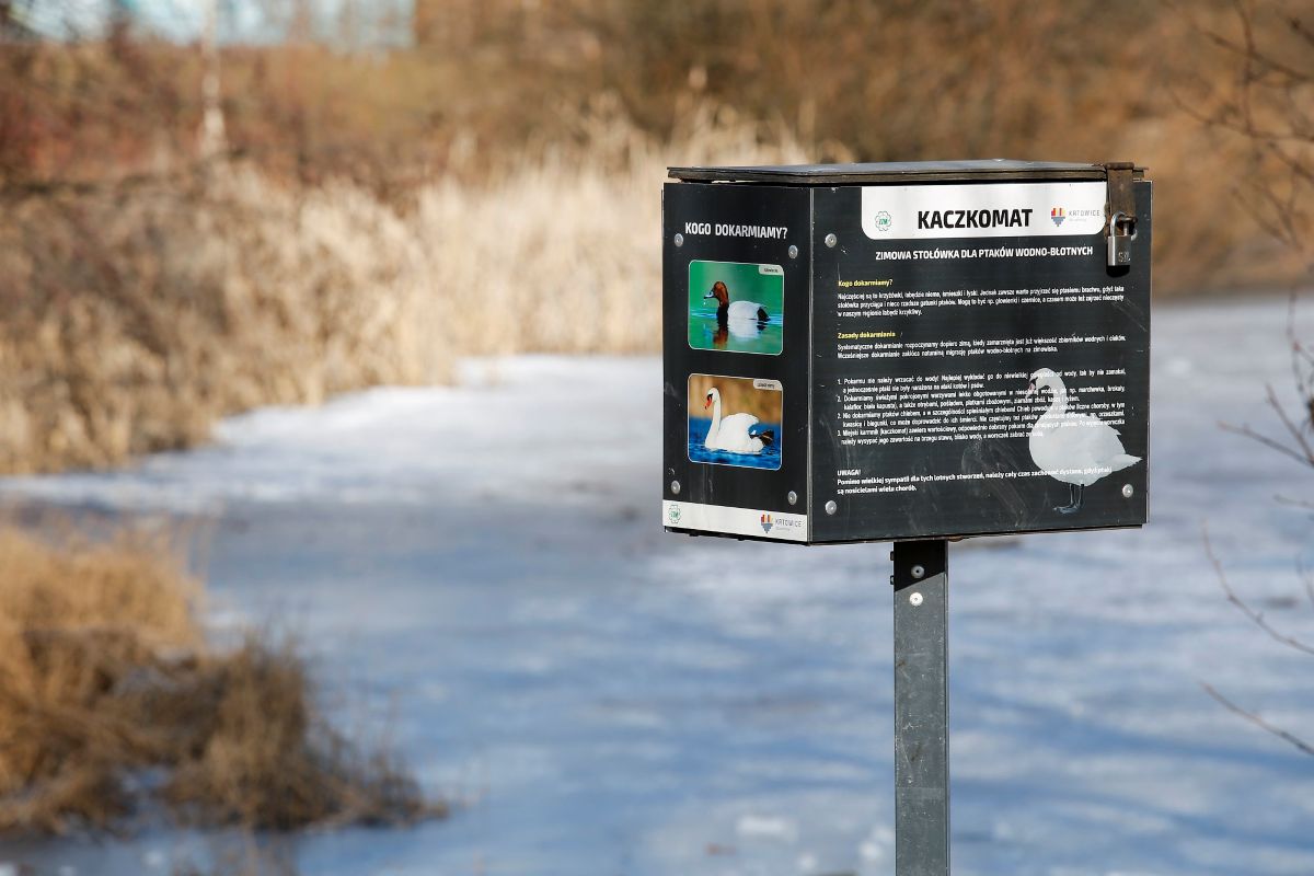 Zakład Zieleni Miejskiejw Katowicach od lat wspiera zimujące ptaki wodne, instalując kaczkomaty – urządzenia z odpowiednio dobranym pokarmem. Dzięki nim mieszkańcy mogą bezpiecznie dokarmiać kaczki, łabędzie nieme, śmieszki i łyski.