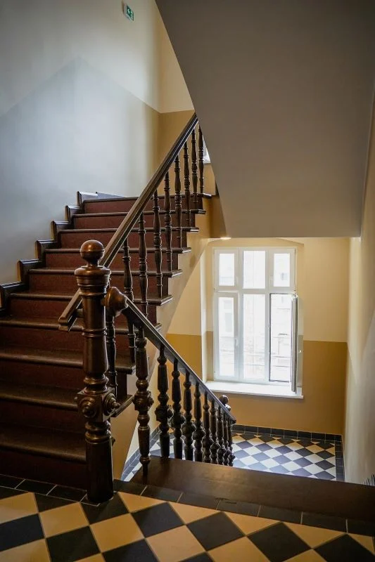 Pierwszym etapem prac w przyziemiu było przygotowanie powierzchni ścian elewacji, która wykazywała głębokie uszkodzenia polegające na wykruszeniu całych połaci ceglanego muru. Po wykonaniu niezbędnych napraw konserwatorzyzabytków przystąpili do pracy. Odtworzono wyjątkowy pas ozdobny na cokole, gzyms nad cokołem, podokienniki schodkowe, wielopłaszczyznowe opaski okienne oraz portal wokół bramy przejazdowej i godło z datą budowy budynku. Nowy wygląd zyskała także klatka schodowa – wymieniona została dekoracyjna posadzka w czarno-białą kratę, odnowione schody, a pod balustradami zamontowano dekoracyjne tralki.