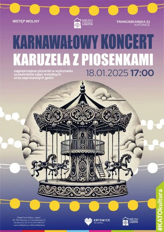 18 stycznia o godzinie 17:00 w MDK Ligota odbędzie się wyjątkowy koncert karnawałowy, podczas którego zaprezentują się uczestnicy zajęć wokalnych. Młodzi artyści przygotowali repertuar, który obejmuje zarówno klasyczne utwory, jak i współczesne hity.