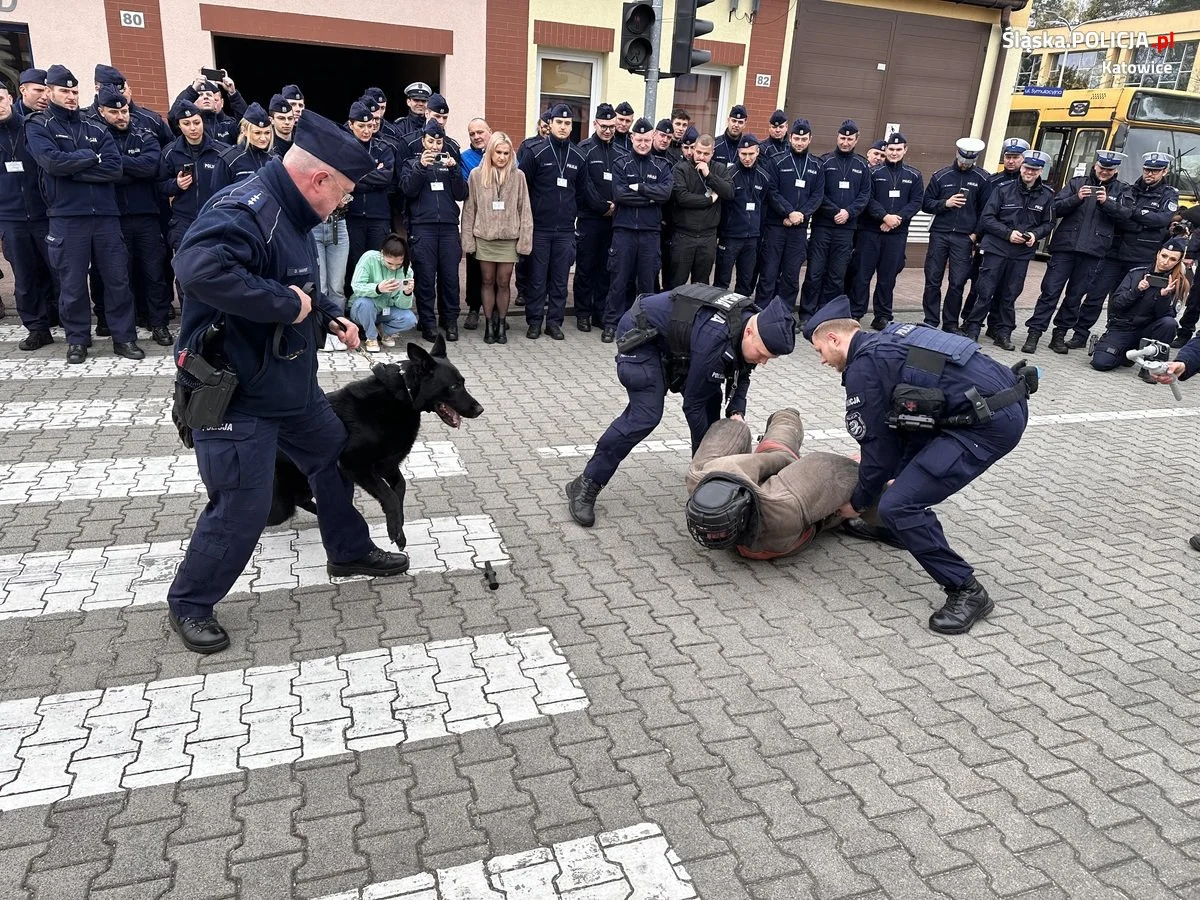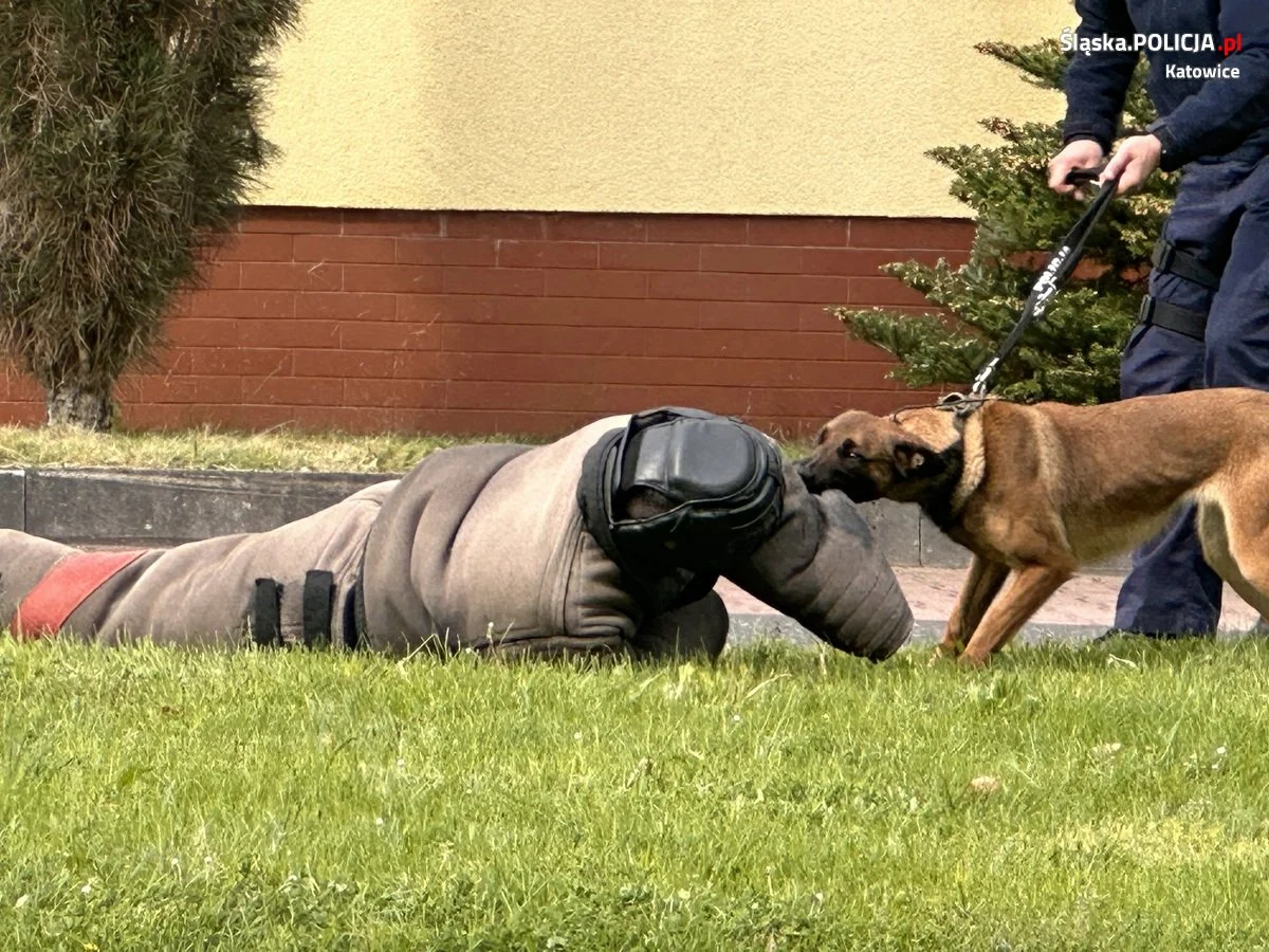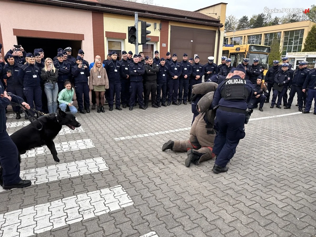 Policyjni przewodnicy psów służbowych i profilaktycy z Wydziału Prewencji Komendy Miejskiej Policji w Katowicach wspólnie z uczniami klasy mundurowej XV LO w Katowicach odwiedzili Szkołę Policji w Katowicach. Powodem odwiedzin był pokaz wyszkolenia psów służbowych, który przygotowali przewodnicy katowickiej komendy. Policjanci wraz ze swoimi czworonożnymi partnerami zaprezentowali ćwiczenia i symulacje różnych sytuacji, które wystąpiły w codziennej służbie. Uczniowie klasy mundurowej a także młodzi policjanci ze szkolenia zawodowego podstawowego mogli zobaczyć pokazy przeszukania pomieszczeń w celu odnalezienia substancji psychoaktywnych czy materiałów wybuchowych. Dodatkowo zaprezentowano trening posłuszeństwa, interwencję z użyciem psa służbowego wobec osoby uzbrojonej w niebezpieczne narządzie oraz taktykę postępowania z osobami zbiorowo naruszającymi porządek publiczny. Pokaz umiejętności czworonogów został ukoronowany działaniami pościgowymi za sprawcą rozboju z użyciem niebezpiecznego narzędzia. Psy i ich przewodnicy z każdym zadaniem poradzili sobie wyśmienicie.