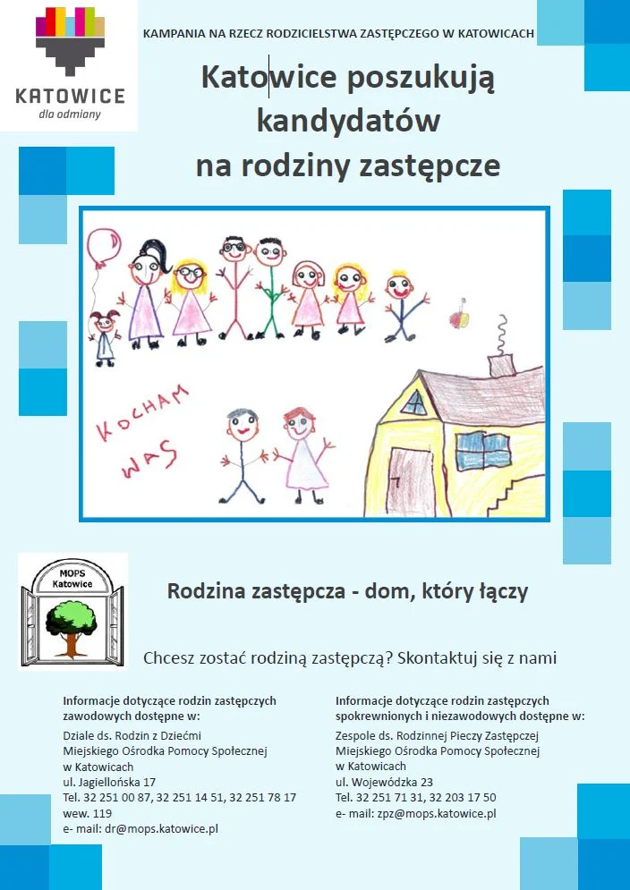 Informacje dotyczące rodzin zastępczych spokrewnionych i niezawodowych dostępne w Zespole ds. Rodzinnej Pieczy Zastępczej Miejskiego Ośrodka Pomocy Społecznej Katowicach, ul. Wojewódzka 23. Tel. 32 251 71 31, 32 203 17 50, e-mail: zpz@ mops.katowice.pl.