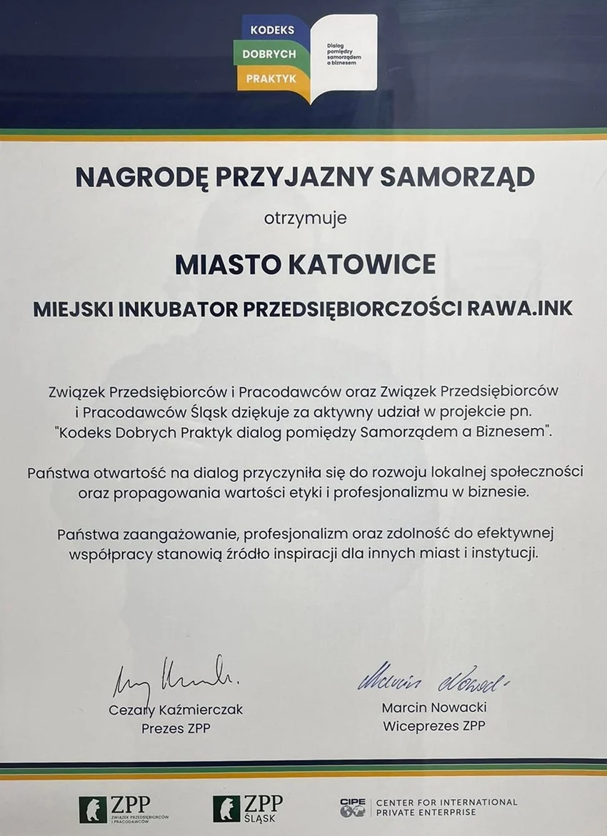 19 września w Miejskim Inkubatorze Przedsiębiorczości Rawa.Ink w Katowicach odbyło się spotkanie podsumowujące projekt „Kodeks Dobrych Praktyk – Dialog pomiędzy samorządem a biznesem”.