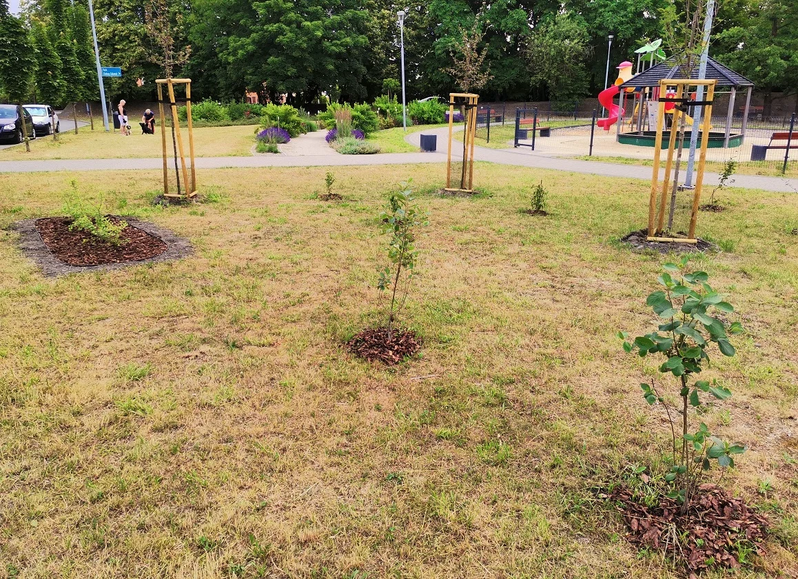 Nowa zieleń pojawiła się także na ul. Słonecznej, gdzie zostały nasadzone zupełnie nowe drzewa liściaste i iglaste – dwie odmiany buka pospolitego i kasztanowców, śliwa wiśniowa „Nigra”, Sosna czarna „Austriaca” i świerk serbski – łącznie 16 drzew.