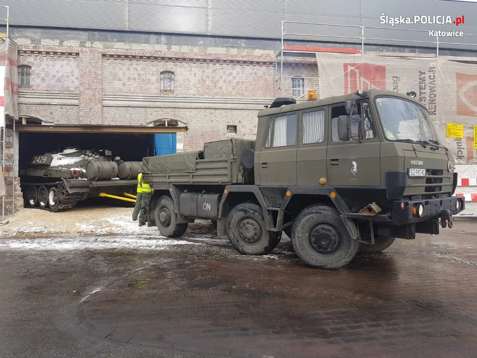 Katowicka drogówka zabezpieczała i pilotowała transport 40-tonowego czołgu T-55, który ustawiony był dotychczas przed KWK „Wujek”.