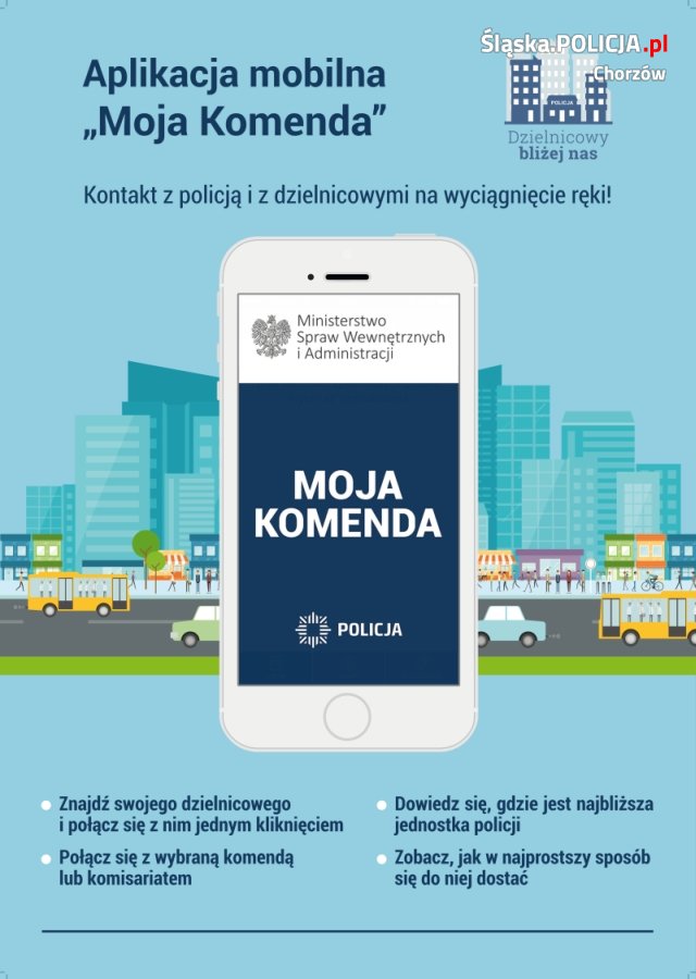 Dla Państwa wygody w ramach programu „Dzielnicowy bliżej nas” opracowano i wdrożono do powszechnego użytku aplikację „Moja Komenda”. Jest to aplikacja bezpłatna, opracowana na urządzenia mobilne bazujące na systemach operacyjnych Android oraz iOS. Po jej zainstalowaniu może pracować w trybie off-line, jednak jej pełne funkcjonalności są widoczne przy zapewnieniu dostępu do sieci Internet. Baza danych zawiera informacje o wszystkich obiektach policyjnych dostępnych dla interesantów, a także dane kontaktowe wszystkich dzielnicowych z terenu kraju. Jest to narzędzie, które zapewnia Państwu szybki dostęp do informacji o adresach i numerach telefonów obiektów policyjnych oraz kontakt ze wszystkimi dzielnicowymi na terenie kraju. Aplikacja została przygotowana z myślą o osobach, które kontaktują się z Policją w sytuacjach innych, niż te bezpośrednio zagrażające życiu lub zdrowiu.