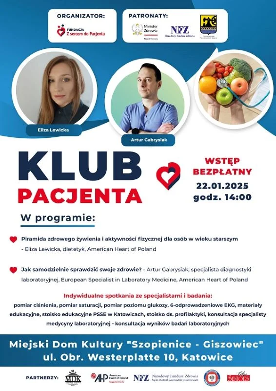 Filia nr 1 MDK Szopienice oraz Fundacja „Z sercem do Pacjenta” zapraszają na wydarzenie KLUB PACJENTA, które odbędzie się 22 stycznia 2025 roku o godzinie 14.00. Spotkanie to wyjątkowa okazja, by dowiedzieć się więcej o zdrowiu, skorzystać z bezpłatnych badań i porozmawiać ze specjalistami.