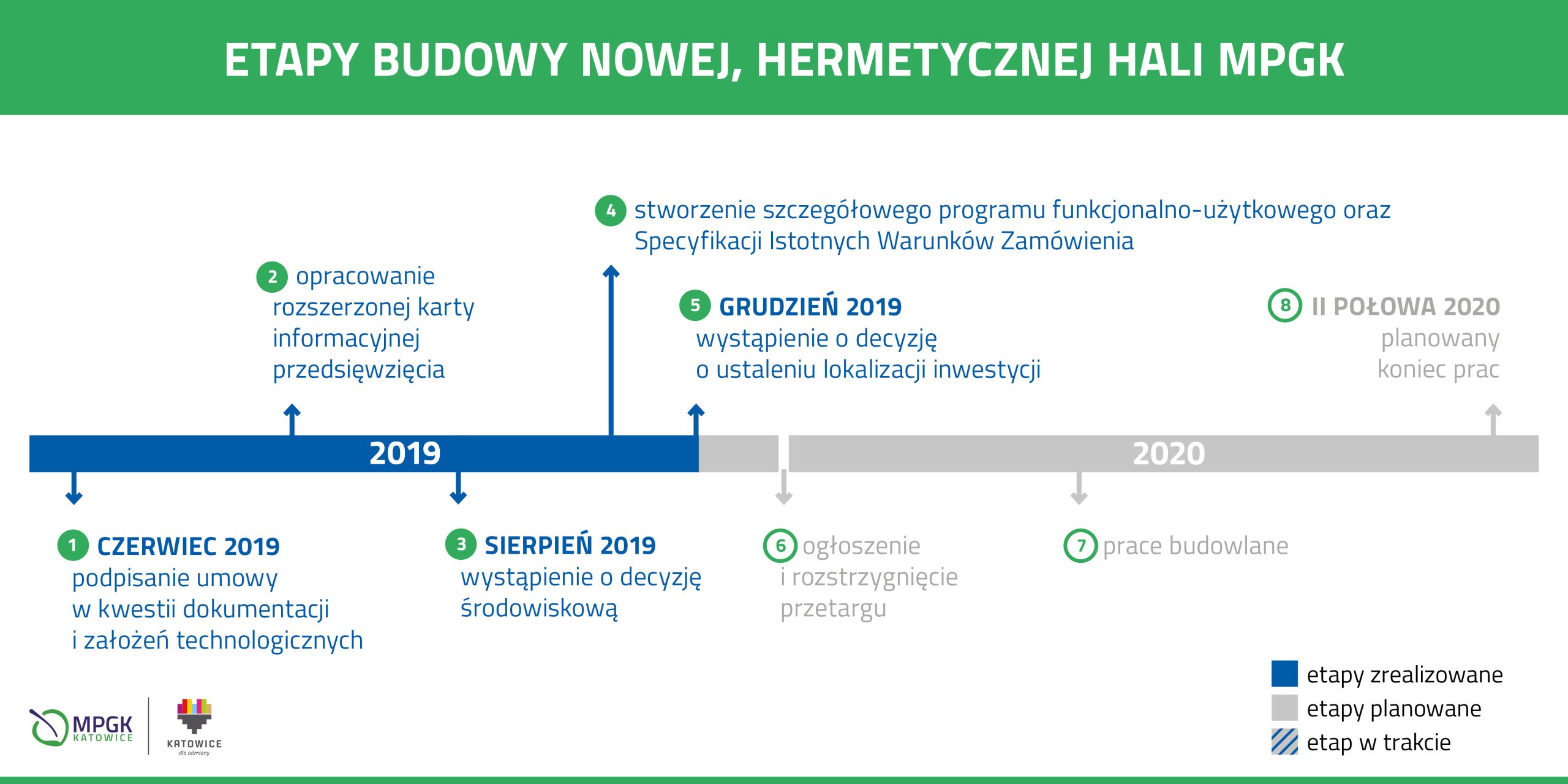 Prace związane z nową, hermetyczną halą Miejskiego Przedsiębiorstwa Gospodarki Komunalnej w Katowicach przy ulicy Milowickiej przyspieszają. W tym tygodniu osiągnięto już piąty z ośmiu zaplanowanych dla projektu kamieni milowych: wystąpiono z wnioskiem o ustalenie lokalizacji tej inwestycji, jako inwestycji celu publicznego.