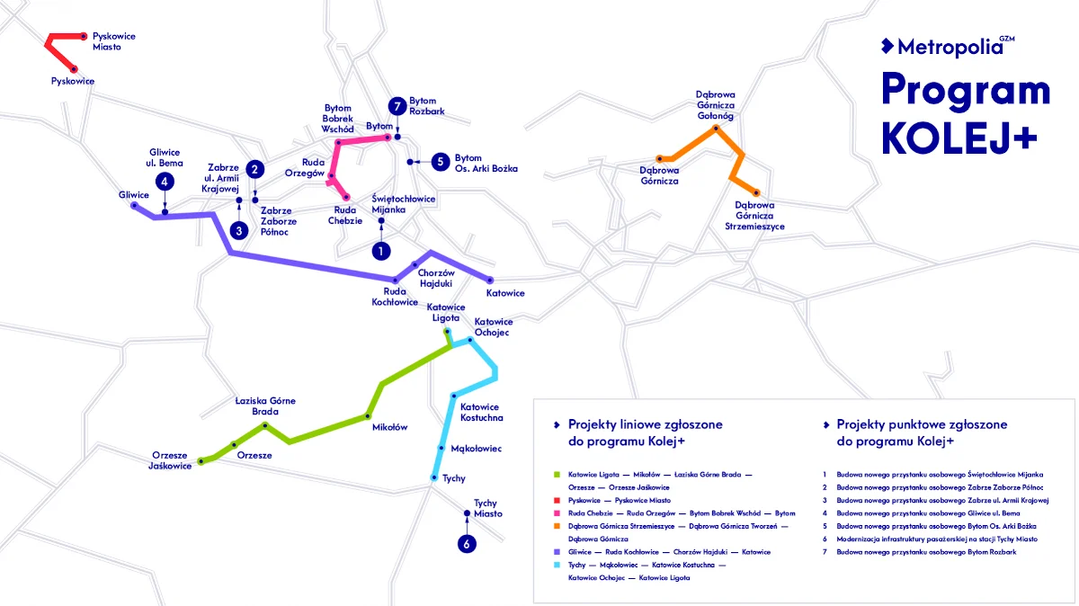 Trwa opracowywanie dokumentacji wymaganej w II etapie Programu „Kolej+”. Jednym z etapów tych prac jest przeprowadzenie konsultacji społecznych dot. projektów zgłoszonych przy udziale Górnośląsko-Zagłębiowskiej Metropolii, w tym jednego wspólnie z Województwem Śląskim. Wszystkie zainteresowane osoby oraz podmioty będą mogły zgłosić swoje uwagi lub przekazać opinię za pośrednictwem ankiety internetowej do 26 września br. włącznie.