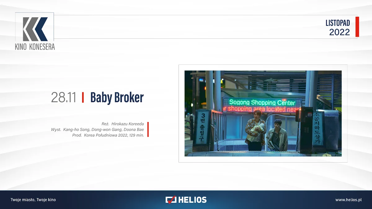 28 listopada w cyklu Kino Konesera zaprezentowany zostanie koreański dramat „Baby Broker”. Dwaj główni bohaterowie, to tytułowi pośrednicy pomiędzy oknem życia, a rodzicami starającymi się o adopcję. Pomijają przy tym wszelkie procedury, inkasując duże pieniądze. Po jednego z niemowlaków do okna życia wraca jednak matka, co komplikuje plan zarobku, a na horyzoncie czai się już policja…