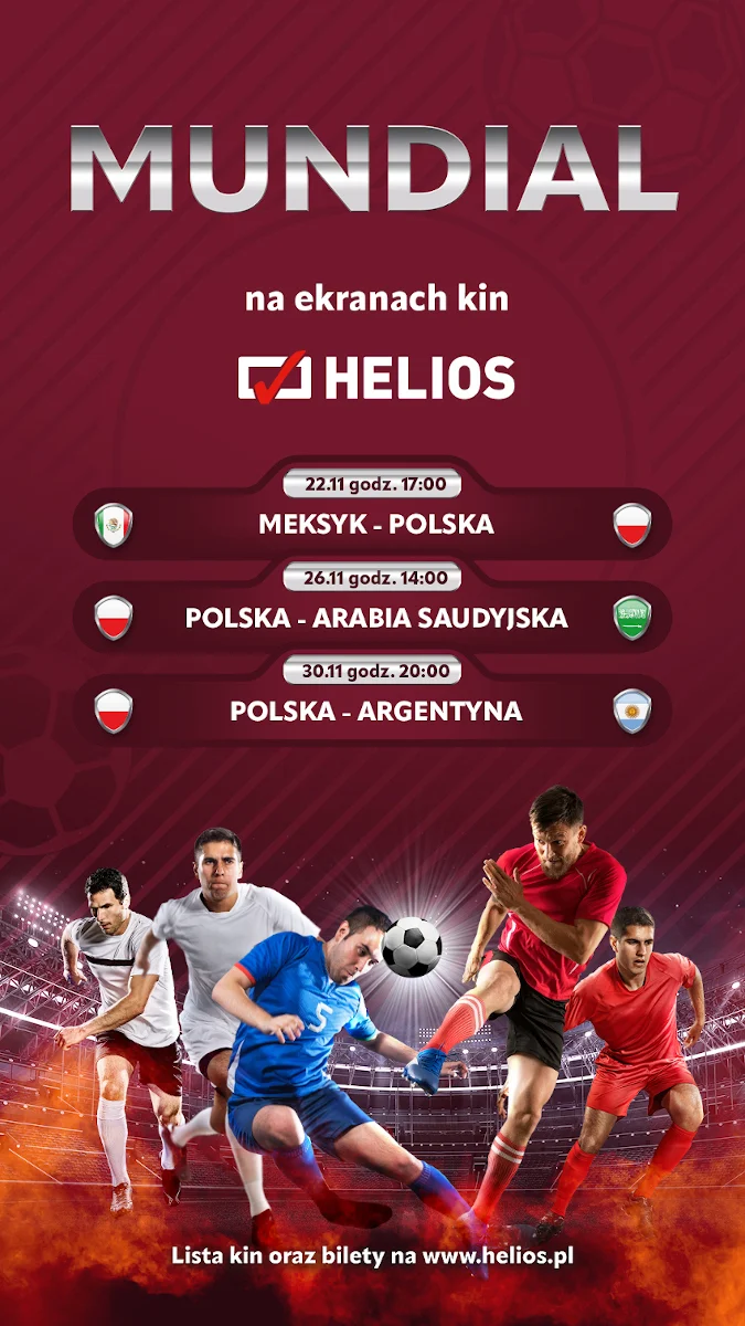 Przed fanami piłki nożnej kolejna dawka wielkich sportowych emocji. Najlepsze reprezentacje walczą o tytuł Mistrza Świata w Katarze. W sobotę, 26 listopada na ekranach wybranych kin Helios zaprezentowany zostanie mecz polskiej reprezentacji z Arabią Saudyjską, a 30 listopada nasza drużyna narodowa zagra z Argentyną.
