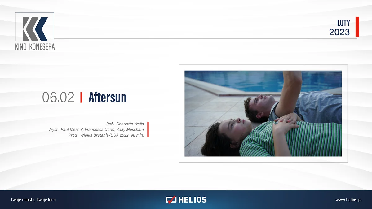 6 lutego fani cyklu Kino Konesera będą mogli wybrać się na seans dramatu „Aftersun”. Młody ojciec Calum i jego córka Sophie wyjeżdżają razem do tureckiego kurortu. Podczas wspólnych wakacji stają się sobie bliżsi niż kiedykolwiek. Niezwykle ciepły i wzruszający debiut Charlotte Wells, który swoją premierę miał na festiwalu w Cannes, zdobył już w tym sezonie ponad 170 nominacji i nagród.